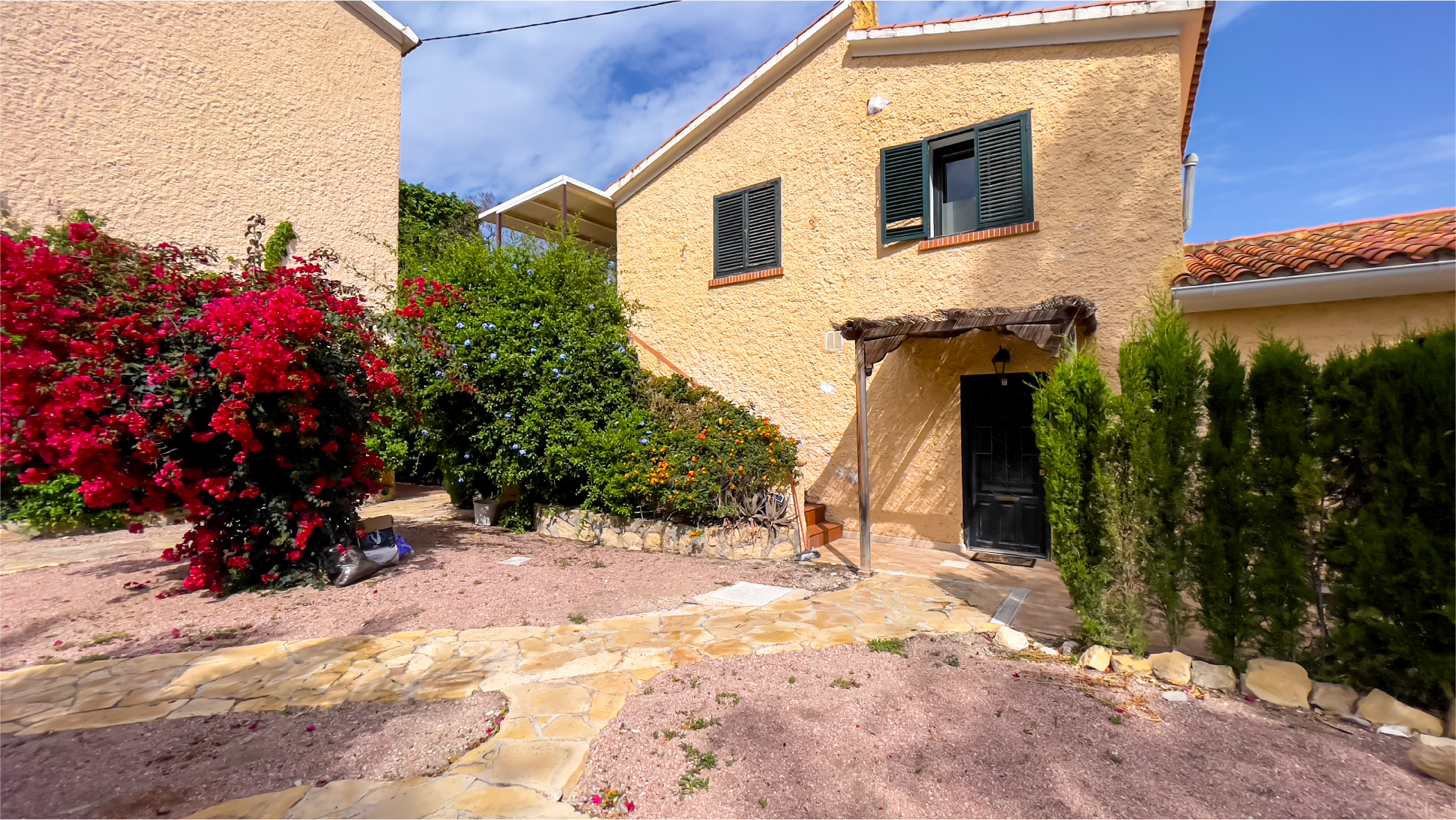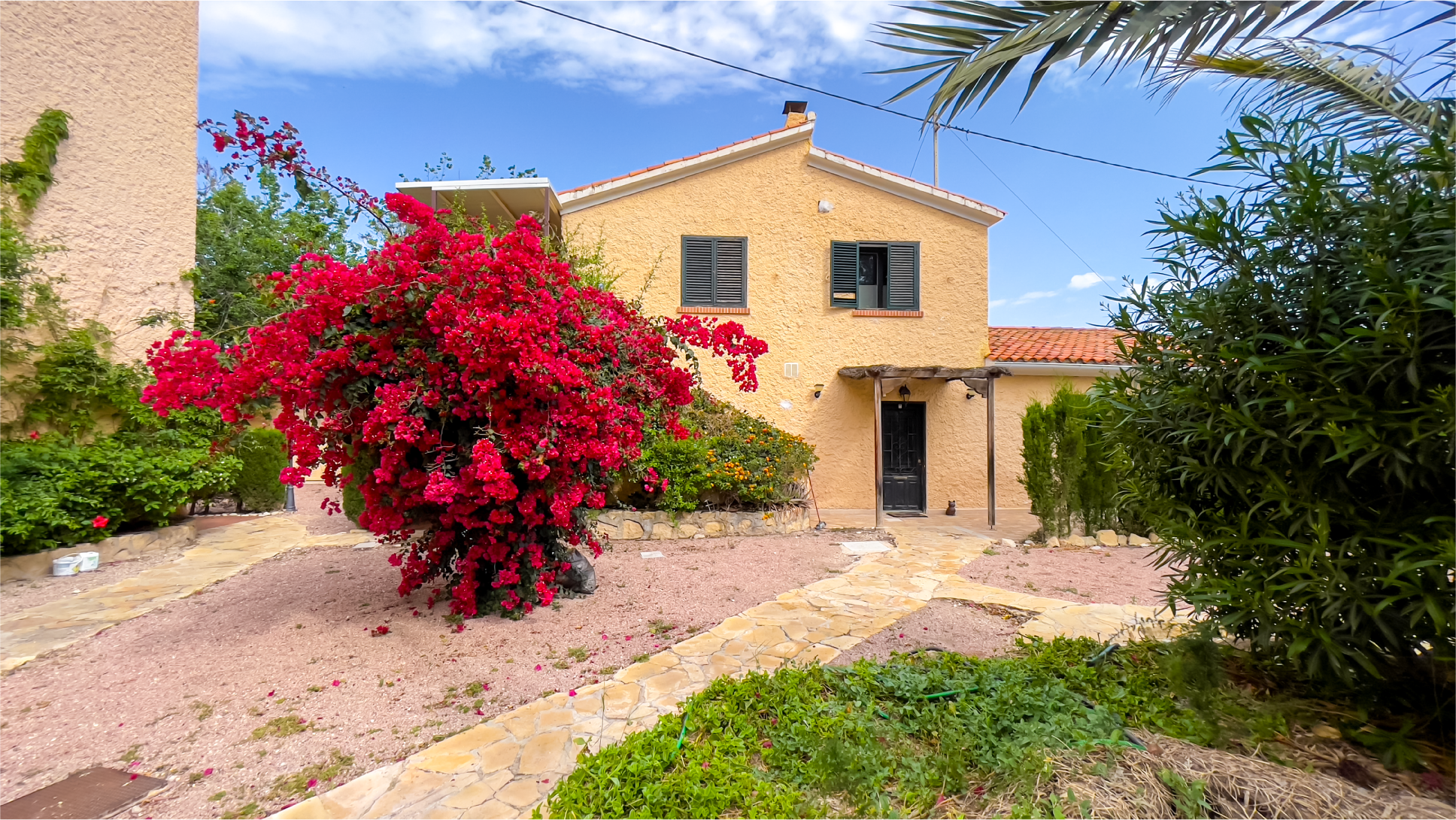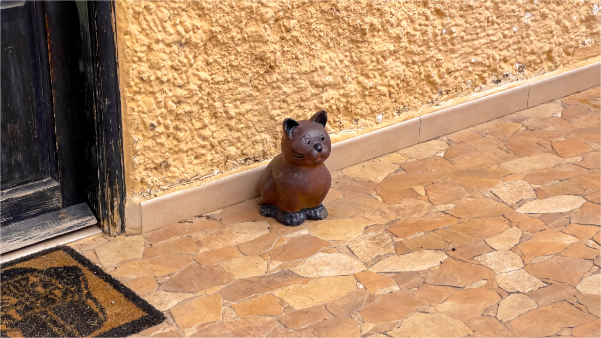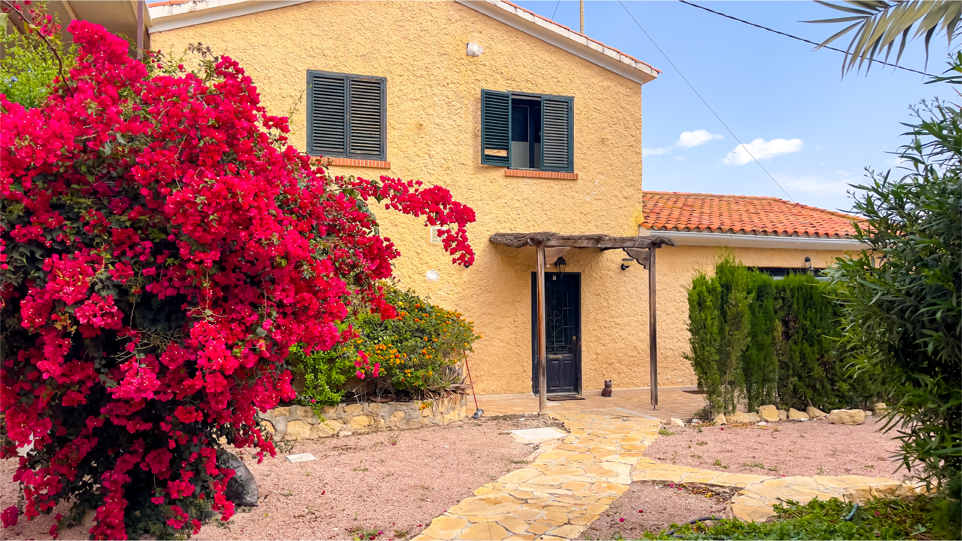 A warm yellow facade paired with a traditional tiled roof creates an atmosphere of charm and elegance. The entrance is surrounded by lush greenery, offering a sense of tranquility from the very first step. A small cat statue at the door adds a welcoming and unique touch.