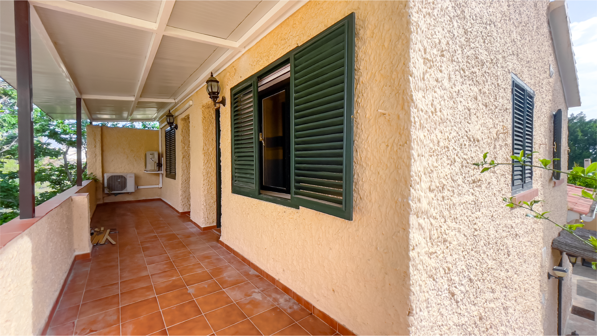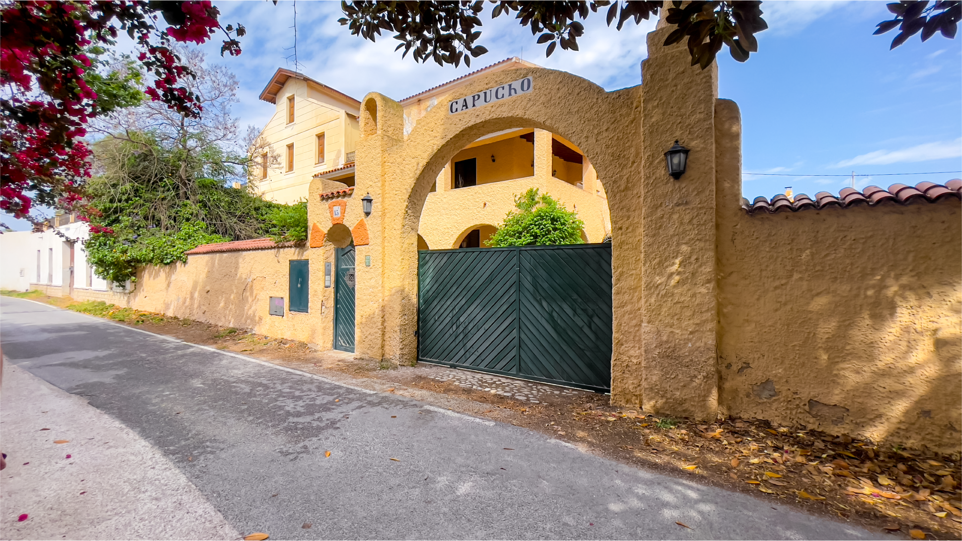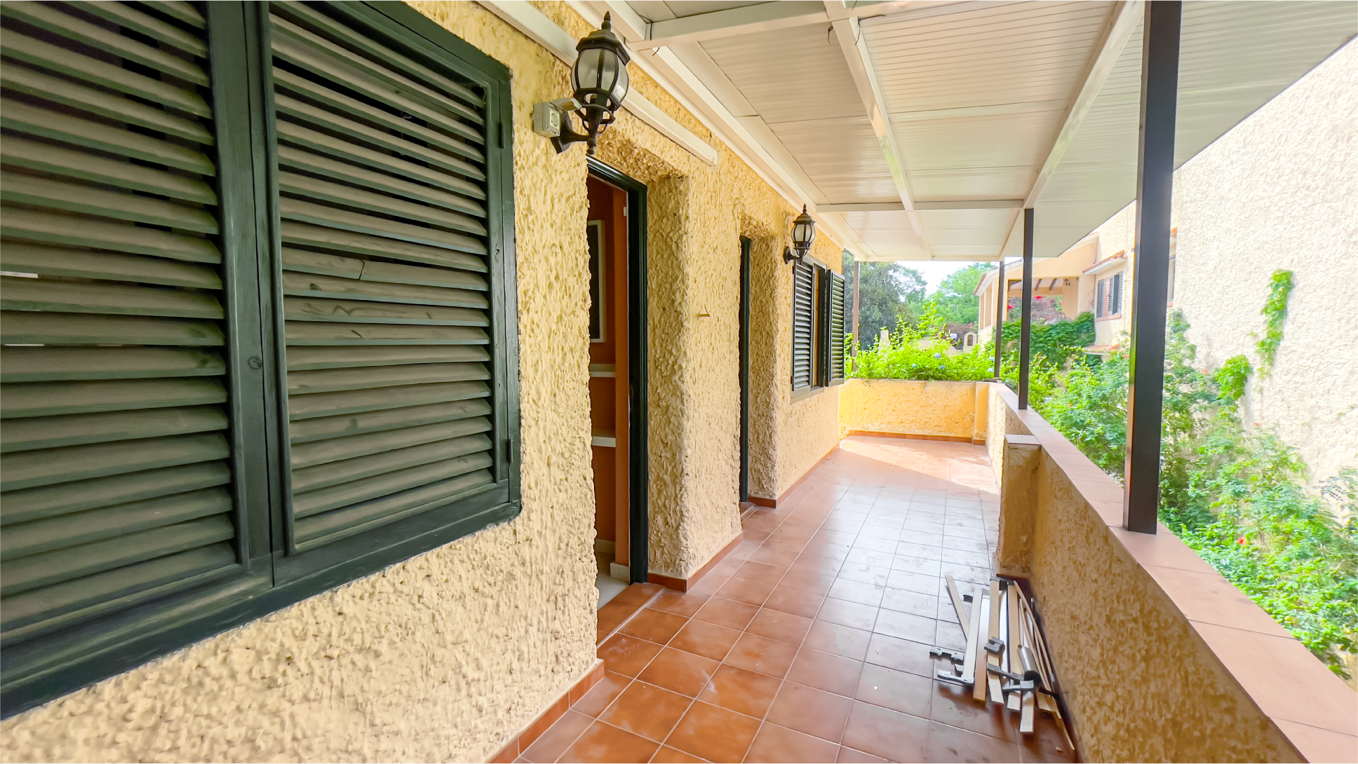 A warm yellow facade paired with a traditional tiled roof creates an atmosphere of charm and elegance. The entrance is surrounded by lush greenery, offering a sense of tranquility from the very first step. A small cat statue at the door adds a welcoming and unique touch.