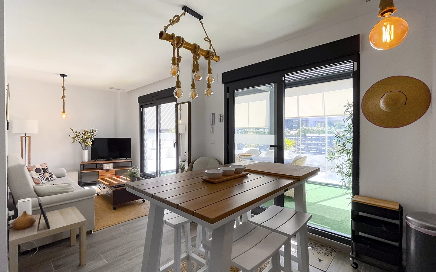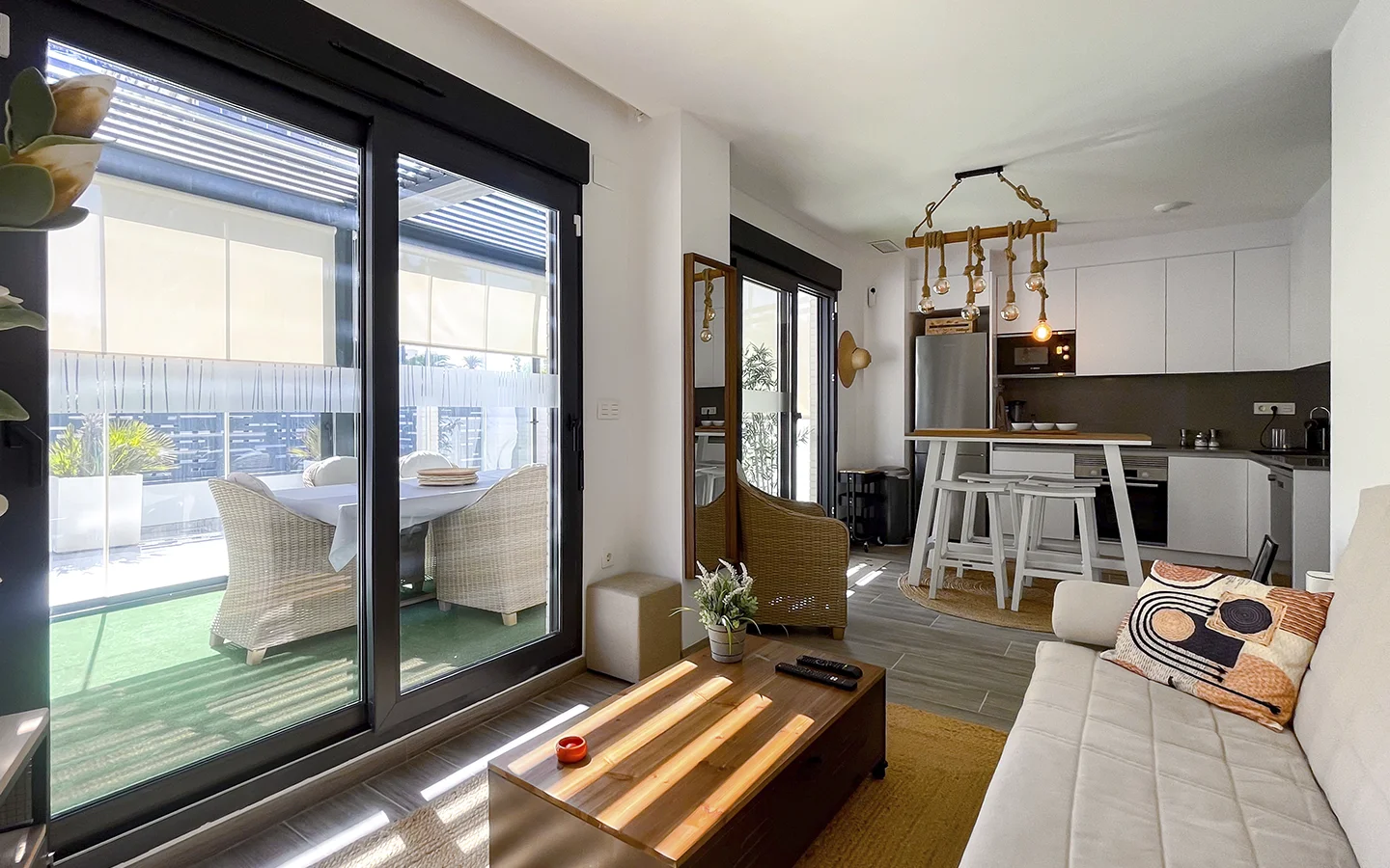 The interior features a neutral and contemporary palette that conveys freshness and order. The living room, with large sliding glass doors, receives abundant natural light and integrates seamlessly with the spacious terrace. The kitchen, with a minimalist style, offers a comfortable work area and integrated appliances. The layout is designed to provide a functional and comfortable space for day-to-day living.