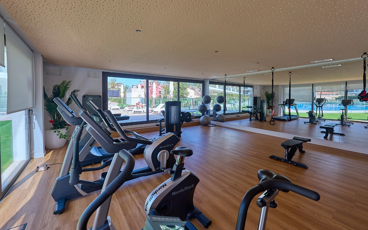 - Panoramiczna siłownia z widokiem na baseny.