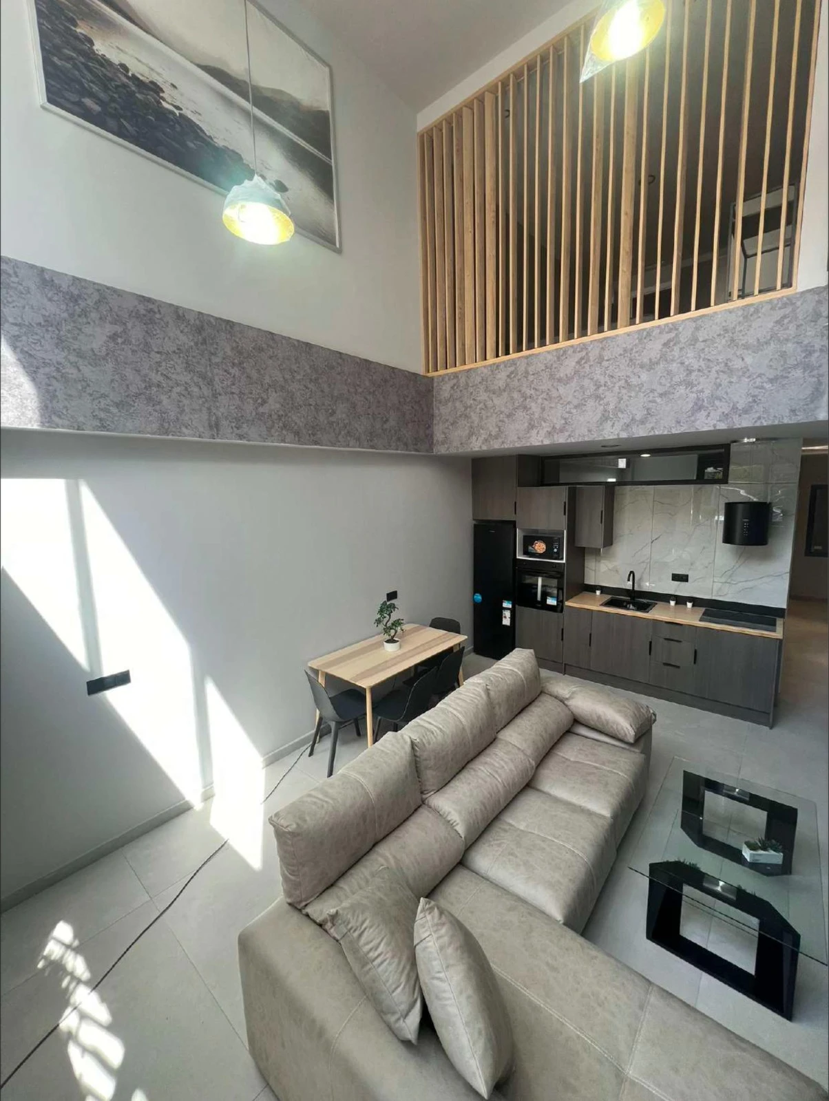 Na parterze znajduje się przestronny salon z podwójną wysokością i dużymi panoramicznymi oknami wychodzącymi na południowy zachód, nowoczesna kuchnia w stylu amerykańskim w pełni wyposażona w sprzęt AGD, jedna sypialnia, łazienka z prysznicem typu walk-in oraz oddzielna pralnia.