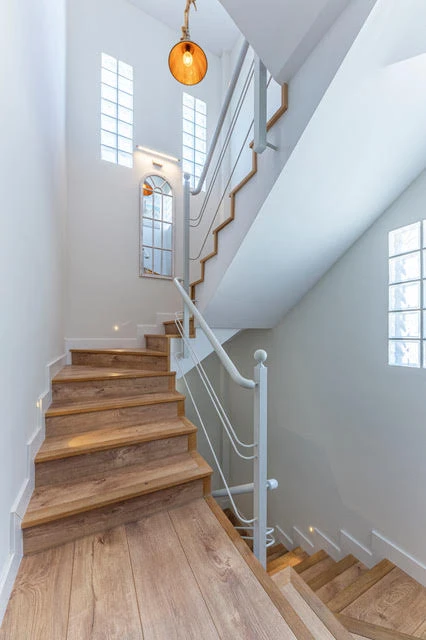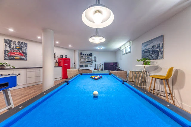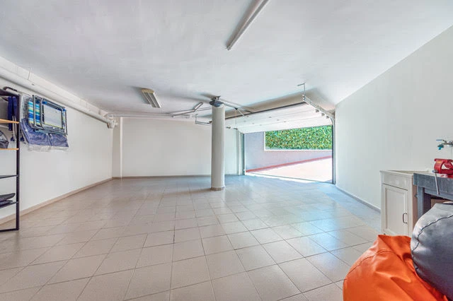 El interior crea una sensación de gran espacio gracias a los techos altos. El área de entrada conduce a un gran vestíbulo que da acceso a todas las habitaciones en el piso principal. La casa cuenta con un Ascensor que conecta el garaje con el segundo piso.