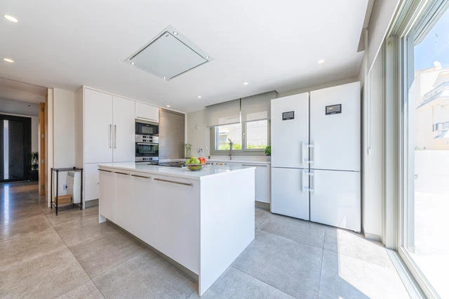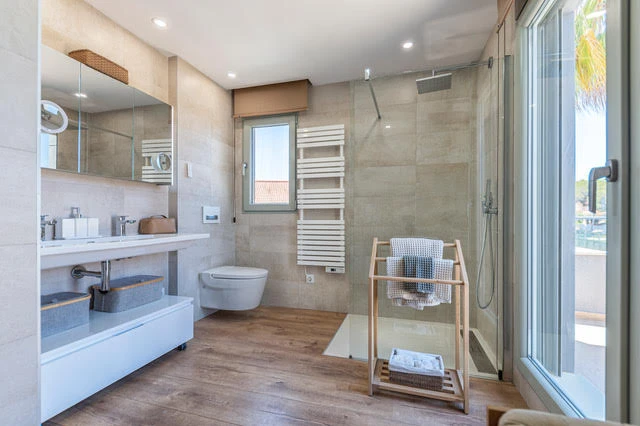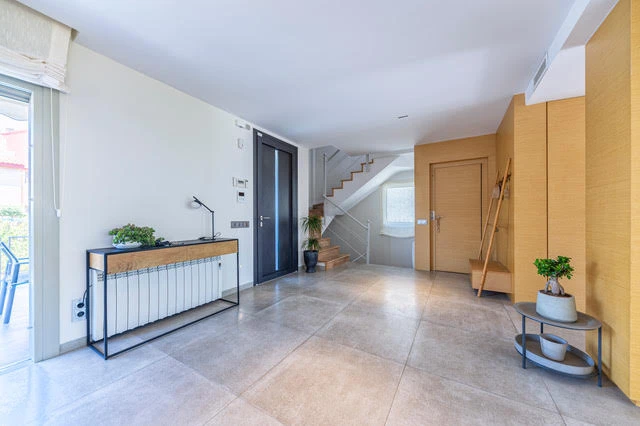 La característica distintiva de esta casa son los materiales de acabado de alta calidad: Suelos de Porcelanosa y madera, paredes lisas y acabados de madera natural, baños y cocina de Porcelanosa, persianas eléctricas, toldo eléctrico, grandes ventanas con vidrio resistente a los impactos de 6 capas, puerta de entrada totalmente reforzada, aire acondicionado con distribución por zonas Airzone, radiadores eléctricos y tuberías solares para agua caliente.