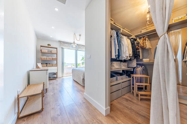 En la planta baja se encuentra el dormitorio principal con acceso a la Terraza, que ofrece magníficas vistas al mar, un Vestidor y un amplio baño con acceso a la otra Terraza. Además, hay otro dormitorio con baño en Suite y armarios empotrados, así como una zona de lavandería.