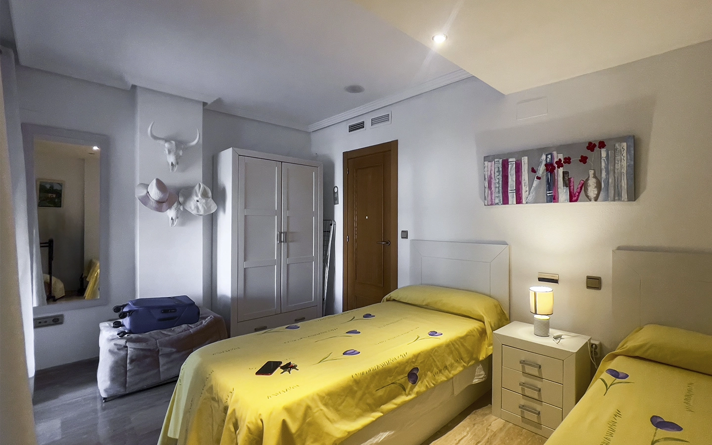 Situado en la segunda planta, dispone de 87 m² de superficie interior y una amplia terraza de unos 25 m² con espectaculares vistas frontales al mar. La distribución abierta conecta el salón comedor con la terraza, creando un espacio perfecto para desayunos al aire libre, tomar el sol o relajarse contemplando el horizonte. El interior, luminoso y de diseño contemporáneo, ofrece dos dormitorios amplios, dos baños completos y acabados de alta calidad, además de aire acondicionado para mayor confort.