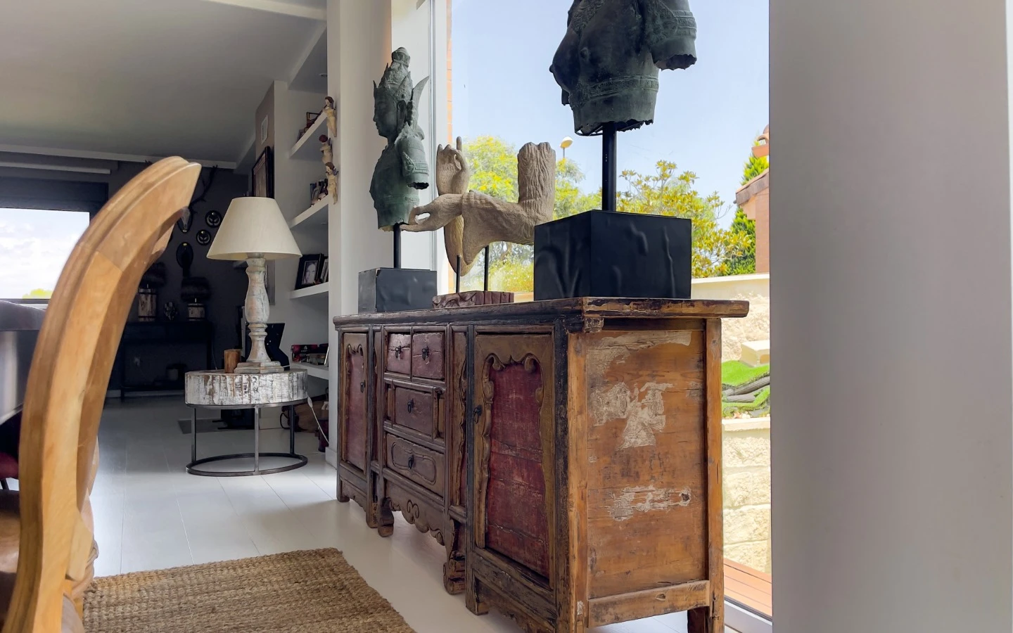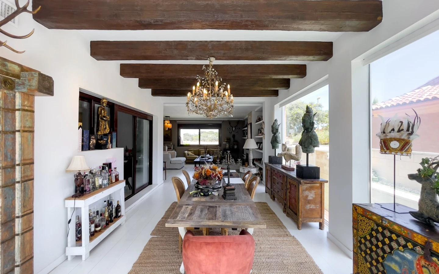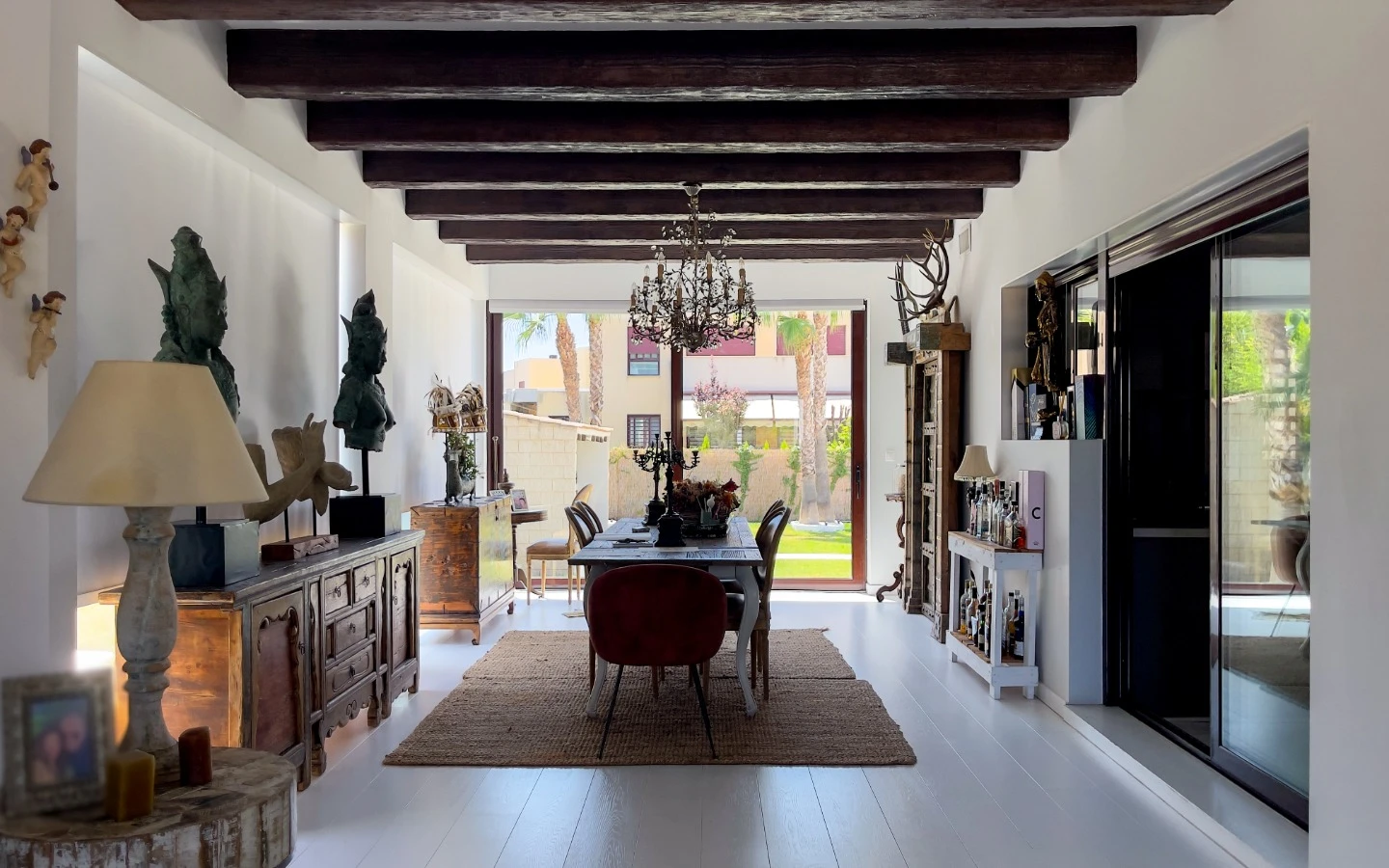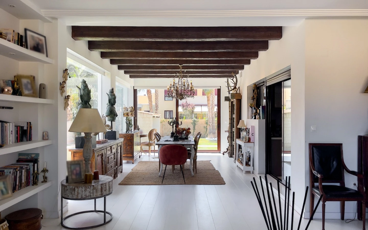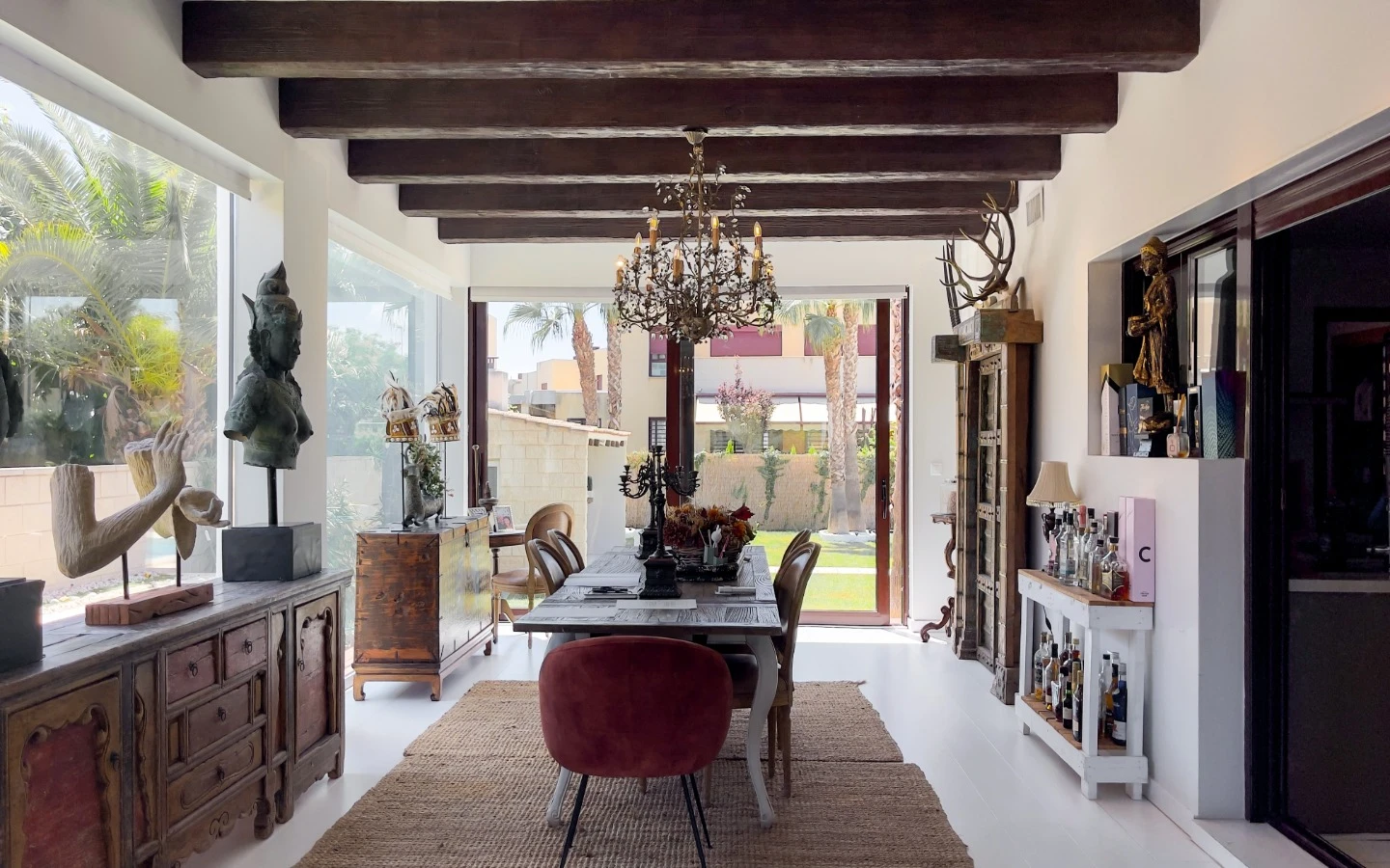 En el interior, la vivienda se presenta como una colección de espacios curados, llenos de luz, texturas y referencias de diseño global. Desde puertas antiguas y consolas artesanales hasta arte tribal e iluminación escultórica, la villa fusiona materiales naturales con un estilo personal. El salón-comedor de planta abierta se conecta con una cocina totalmente equipada con isla central, perfecta tanto para la vida diaria como para reuniones sociales. Cada dormitorio tiene su carácter propio: desde la serena suite principal hasta un dormitorio infantil lleno de color y un vestidor de estilo boutique. La planta inferior amplía las posibilidades con más dormitorios, un salón, baño, espacio creativo o de bienestar y acceso directo al jardín.