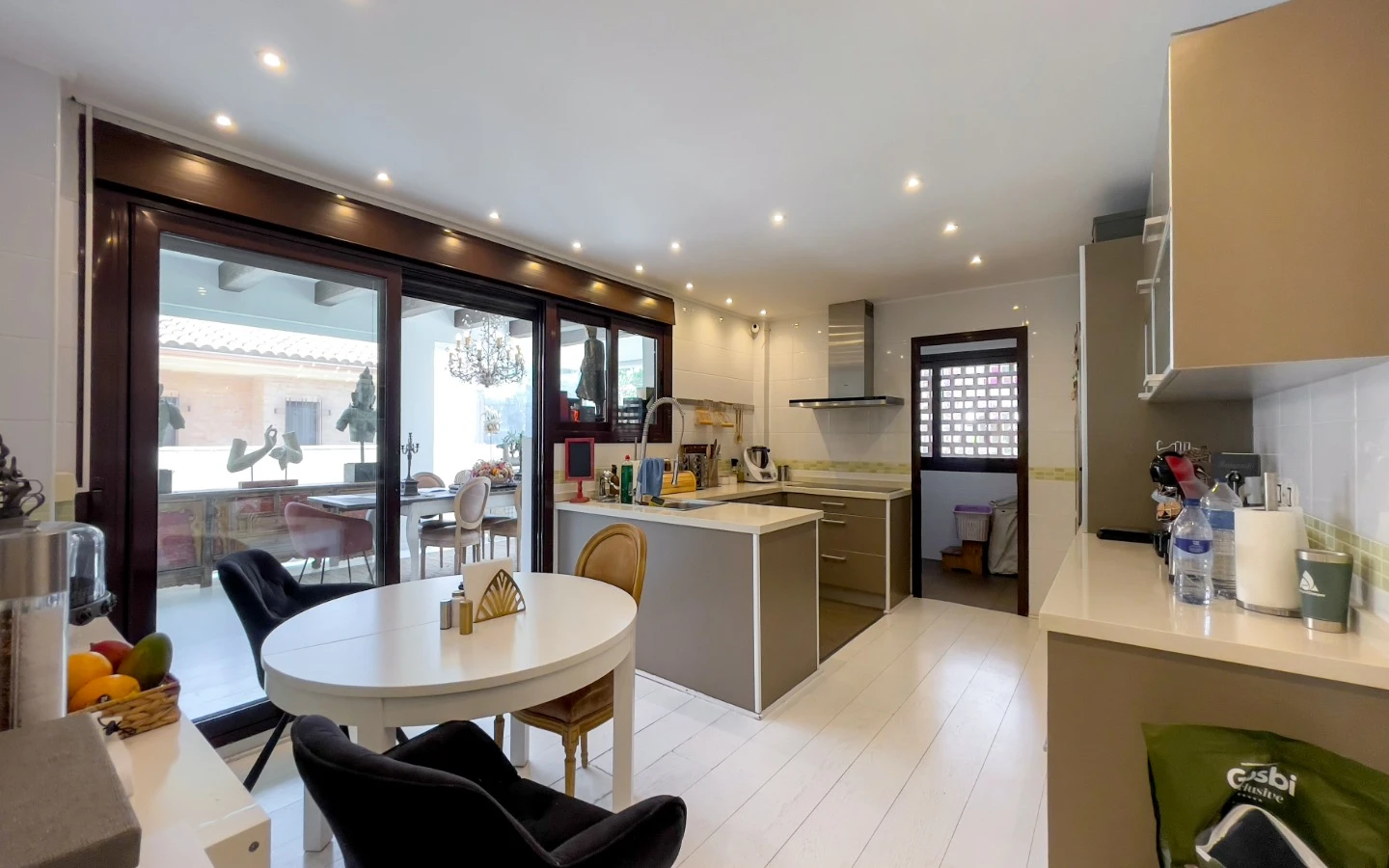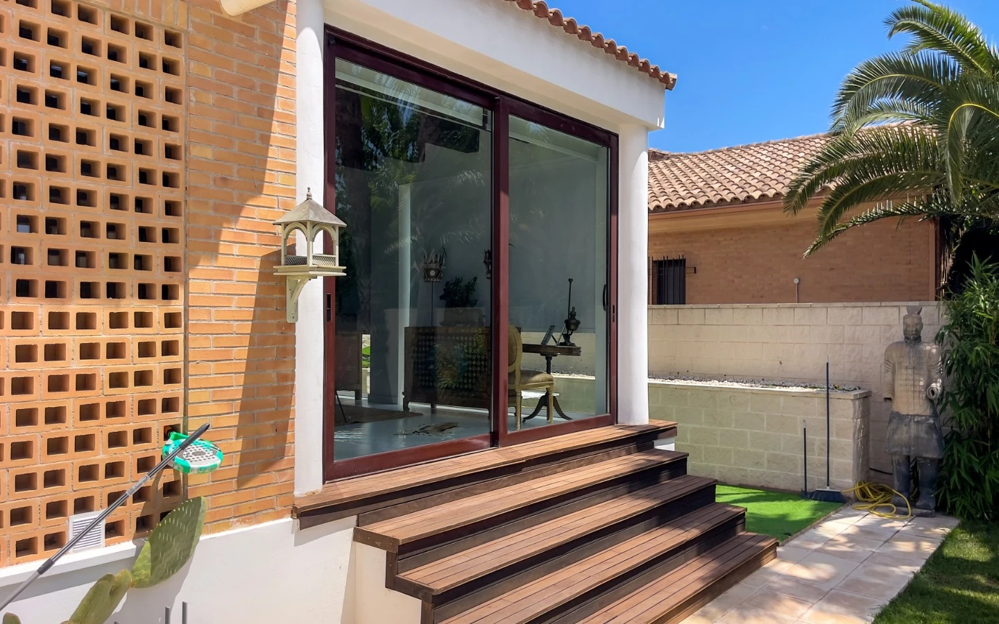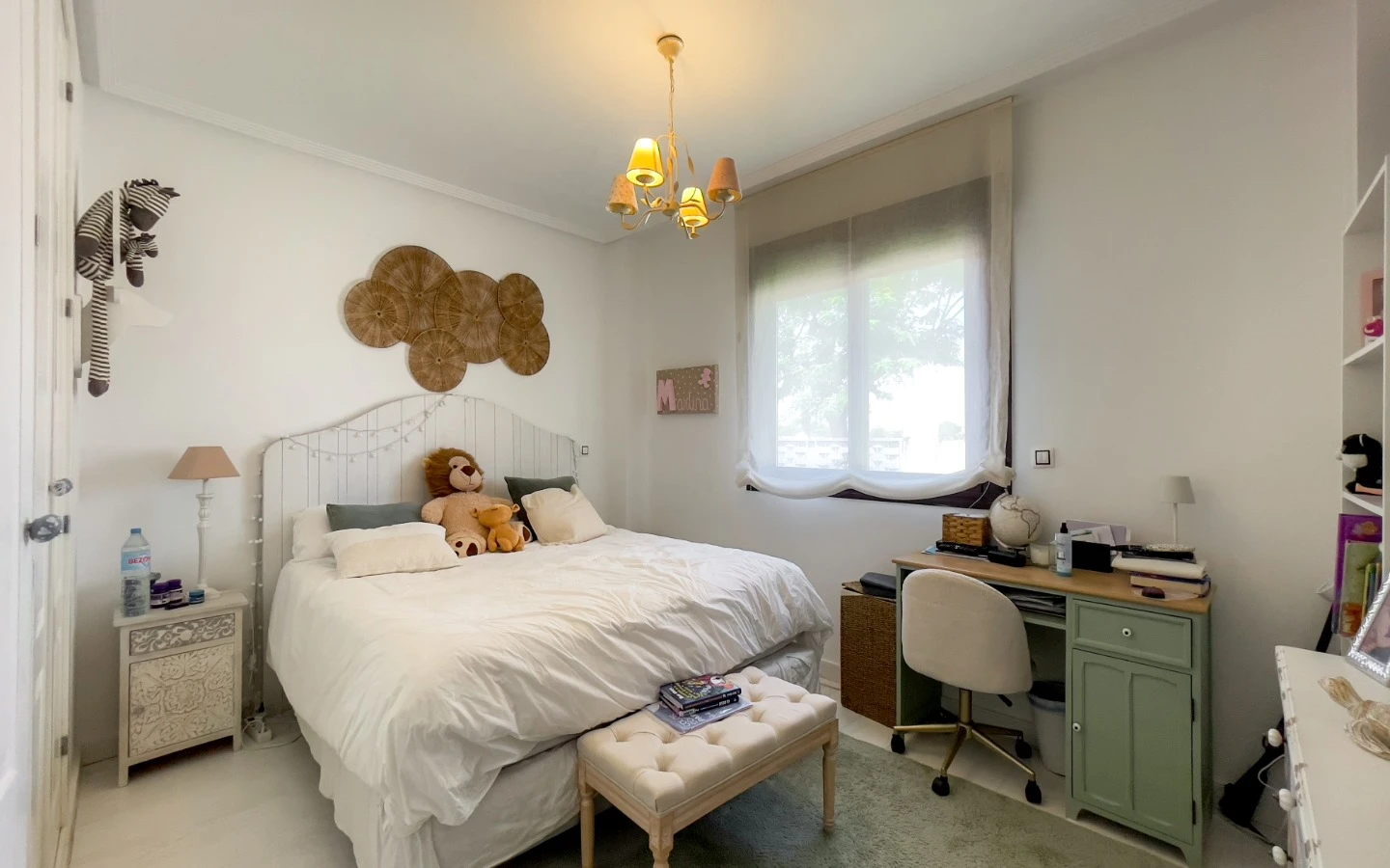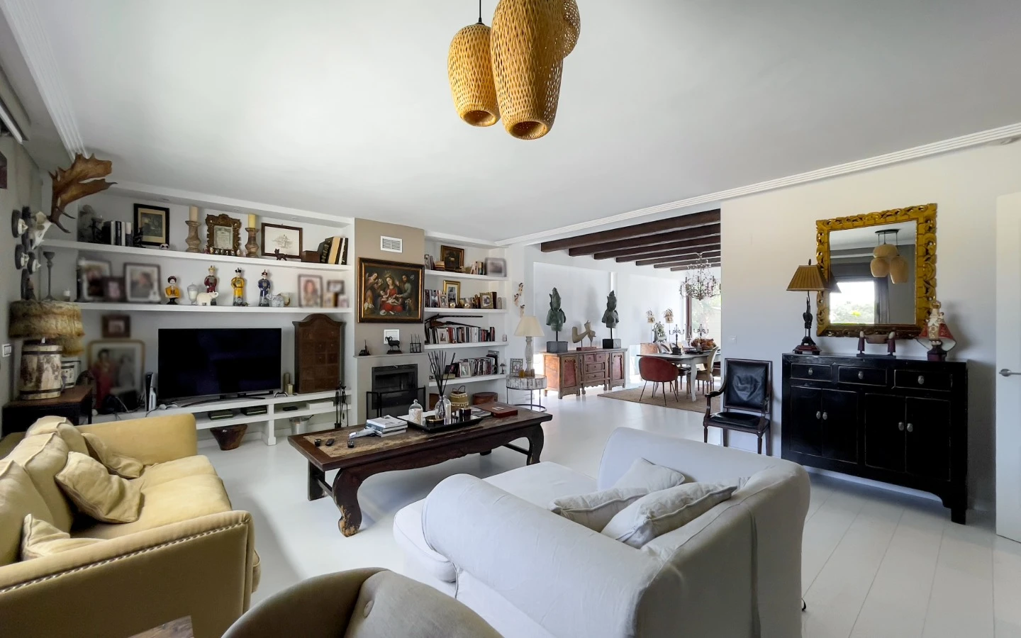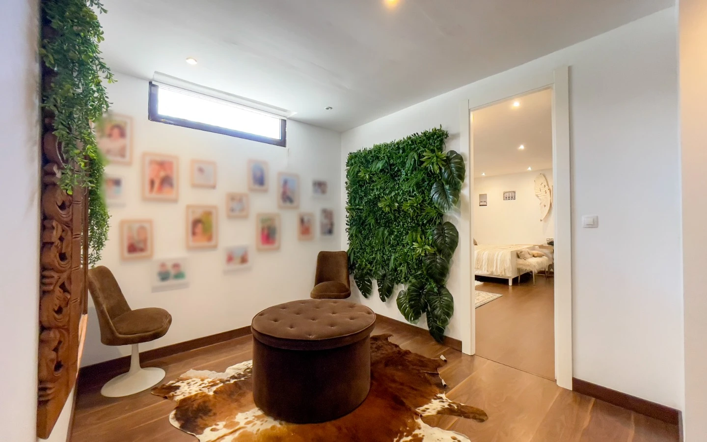 En el interior, la vivienda se presenta como una colección de espacios curados, llenos de luz, texturas y referencias de diseño global. Desde puertas antiguas y consolas artesanales hasta arte tribal e iluminación escultórica, la villa fusiona materiales naturales con un estilo personal. El salón-comedor de planta abierta se conecta con una cocina totalmente equipada con isla central, perfecta tanto para la vida diaria como para reuniones sociales. Cada dormitorio tiene su carácter propio: desde la serena suite principal hasta un dormitorio infantil lleno de color y un vestidor de estilo boutique. La planta inferior amplía las posibilidades con más dormitorios, un salón, baño, espacio creativo o de bienestar y acceso directo al jardín.