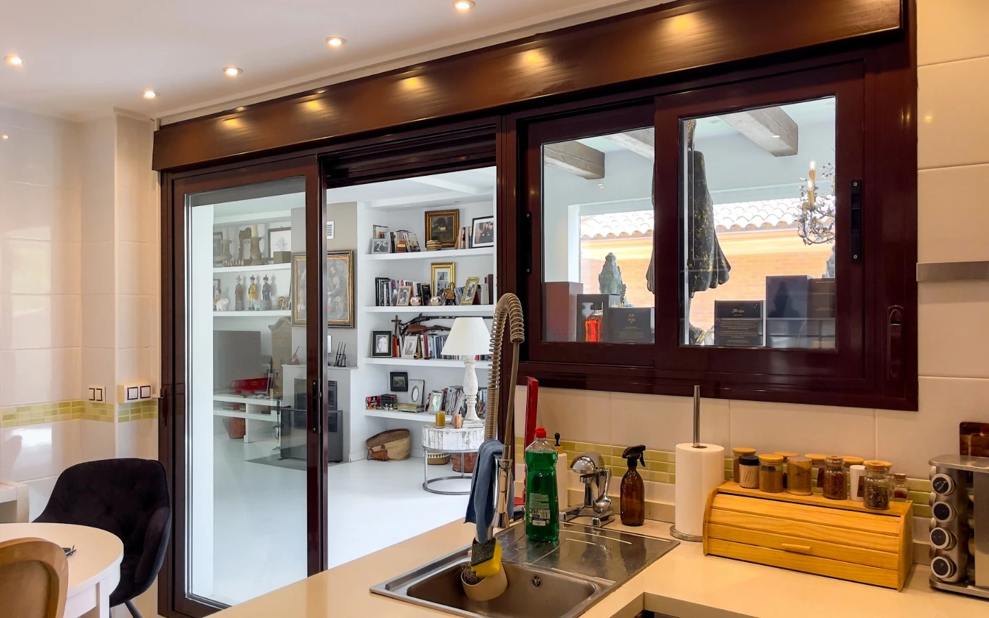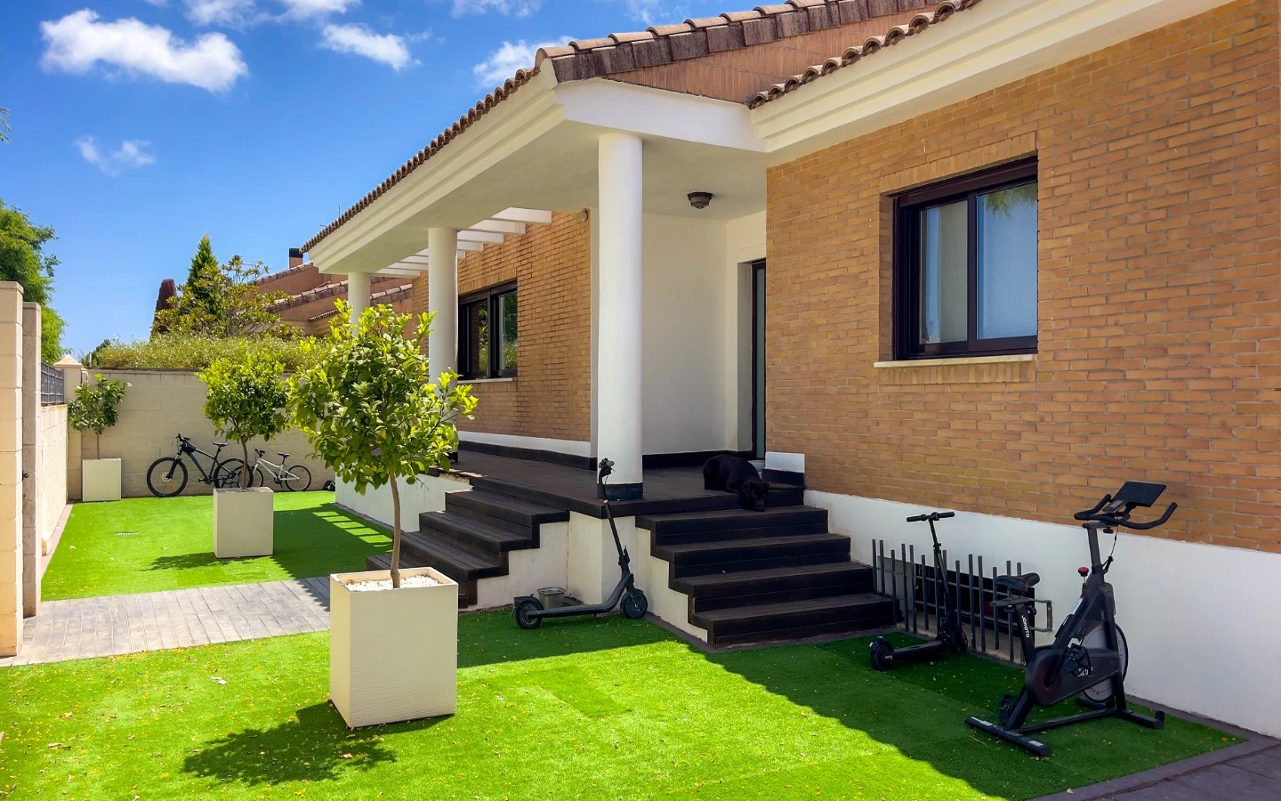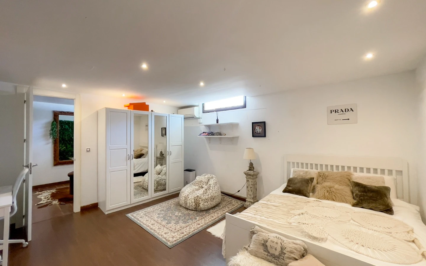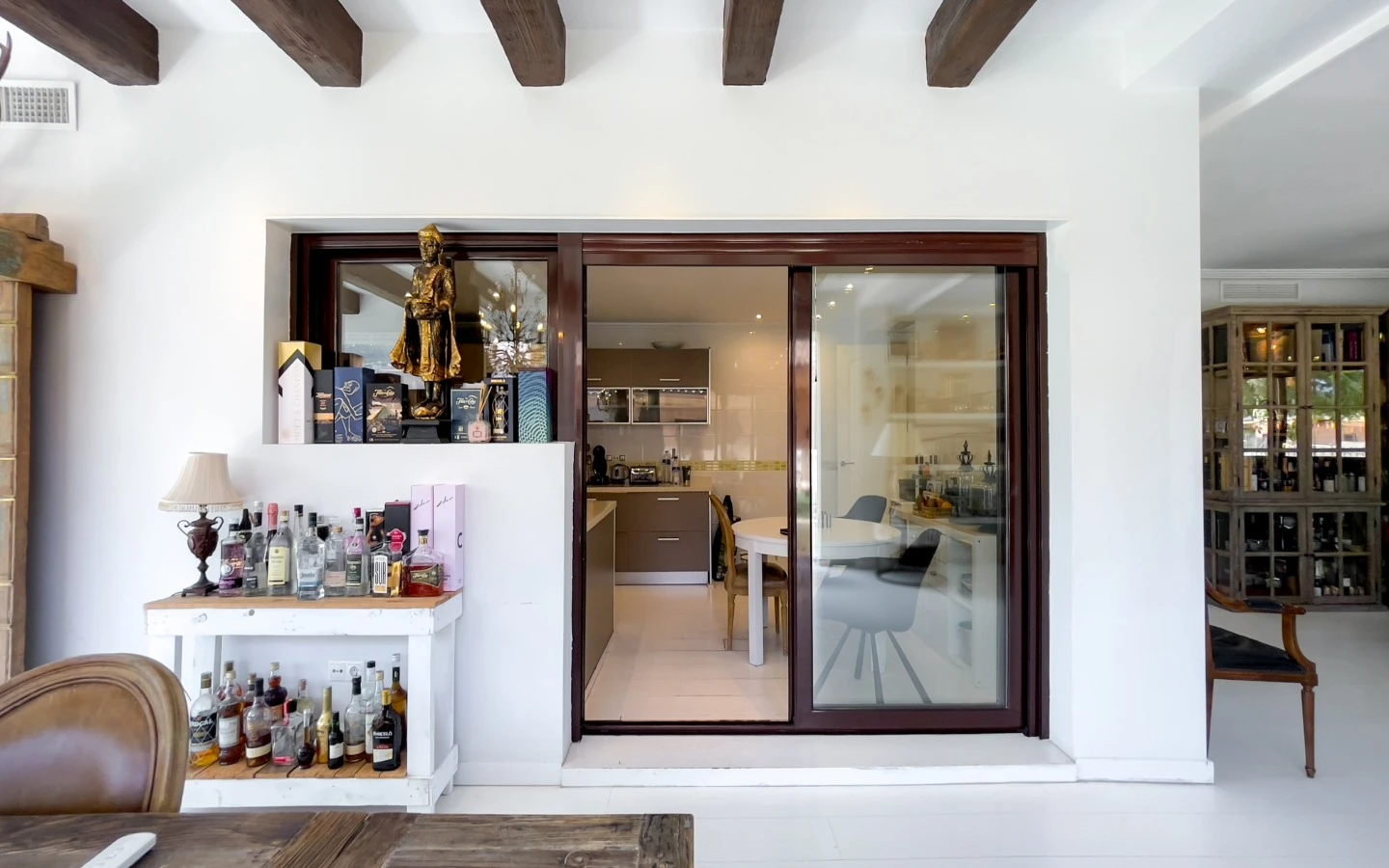 En el interior, la vivienda se presenta como una colección de espacios curados, llenos de luz, texturas y referencias de diseño global. Desde puertas antiguas y consolas artesanales hasta arte tribal e iluminación escultórica, la villa fusiona materiales naturales con un estilo personal. El salón-comedor de planta abierta se conecta con una cocina totalmente equipada con isla central, perfecta tanto para la vida diaria como para reuniones sociales. Cada dormitorio tiene su carácter propio: desde la serena suite principal hasta un dormitorio infantil lleno de color y un vestidor de estilo boutique. La planta inferior amplía las posibilidades con más dormitorios, un salón, baño, espacio creativo o de bienestar y acceso directo al jardín.