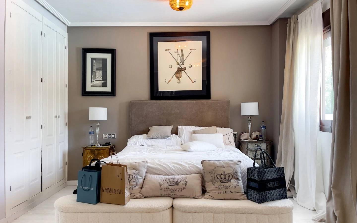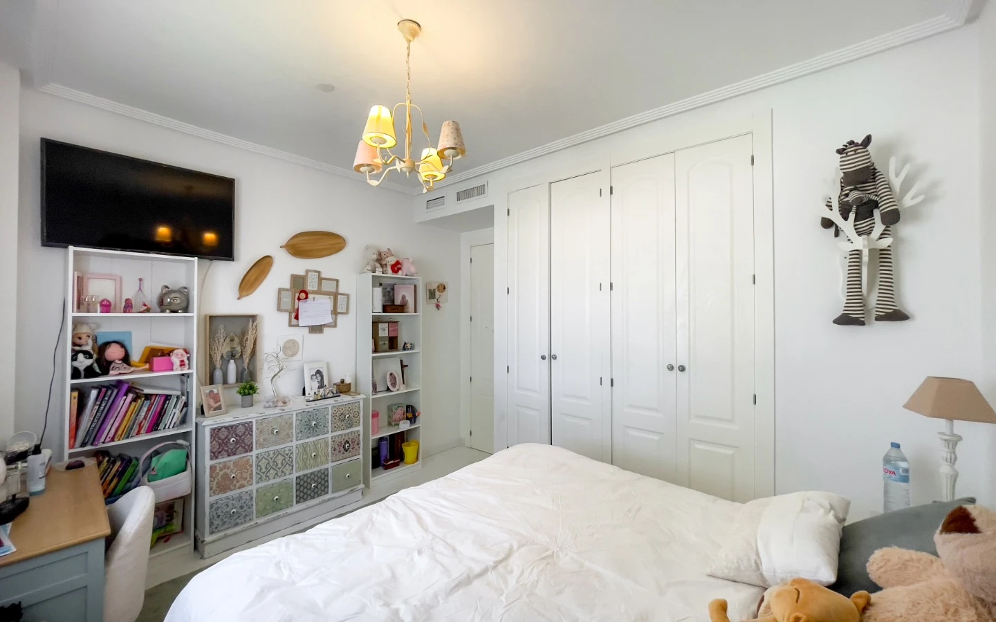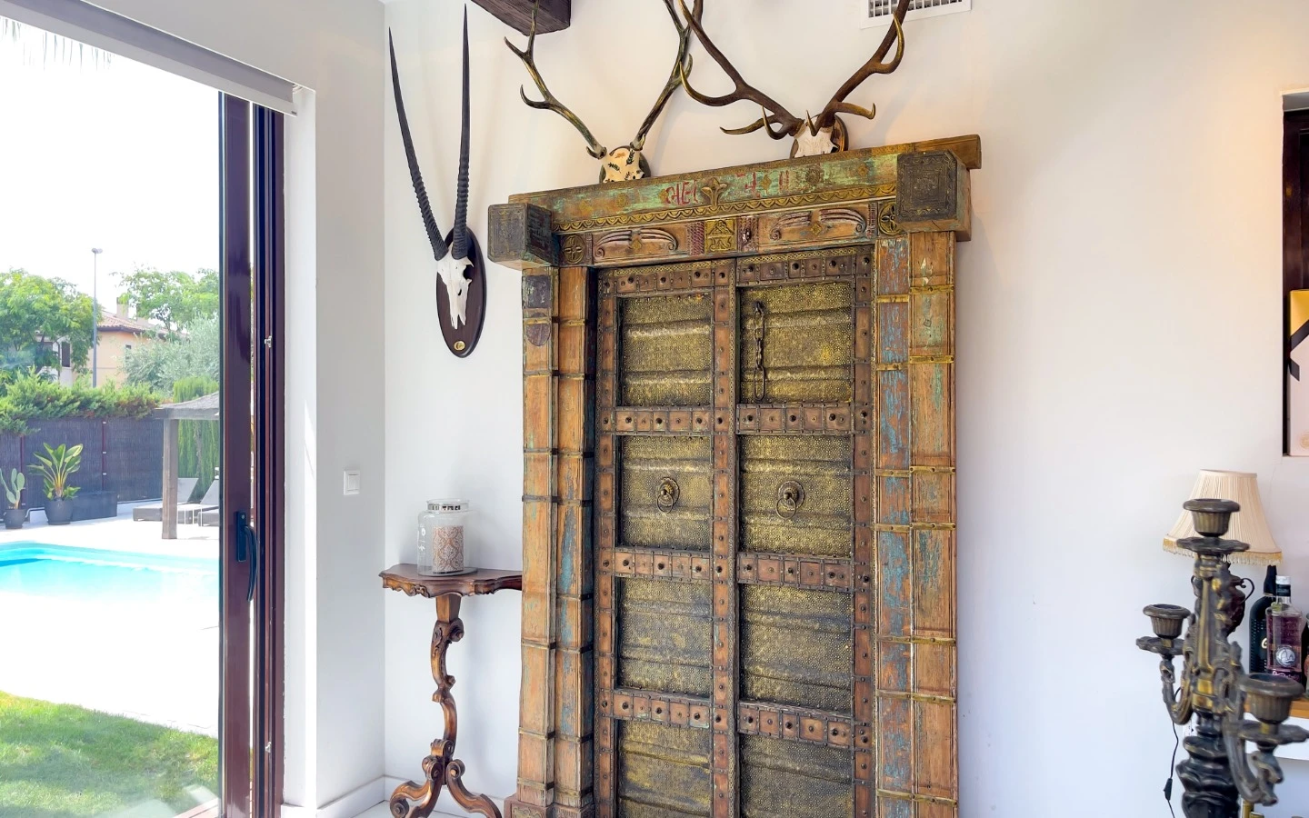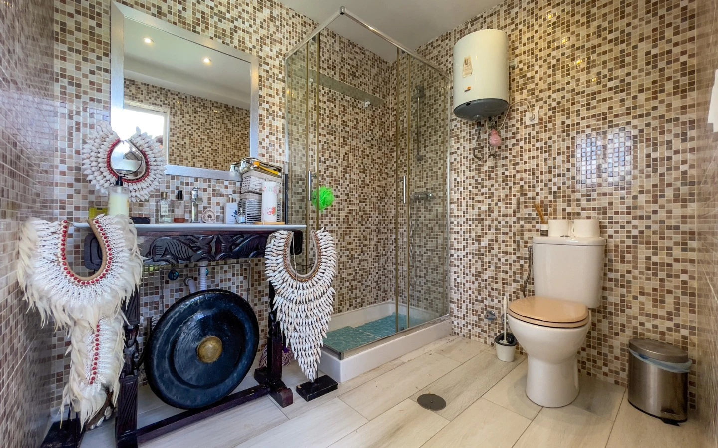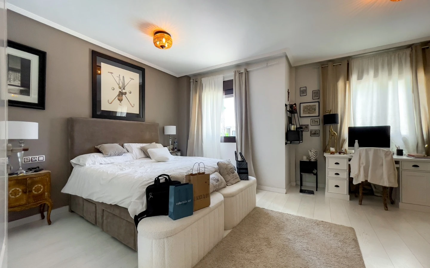En el interior, la vivienda se presenta como una colección de espacios curados, llenos de luz, texturas y referencias de diseño global. Desde puertas antiguas y consolas artesanales hasta arte tribal e iluminación escultórica, la villa fusiona materiales naturales con un estilo personal. El salón-comedor de planta abierta se conecta con una cocina totalmente equipada con isla central, perfecta tanto para la vida diaria como para reuniones sociales. Cada dormitorio tiene su carácter propio: desde la serena suite principal hasta un dormitorio infantil lleno de color y un vestidor de estilo boutique. La planta inferior amplía las posibilidades con más dormitorios, un salón, baño, espacio creativo o de bienestar y acceso directo al jardín.
