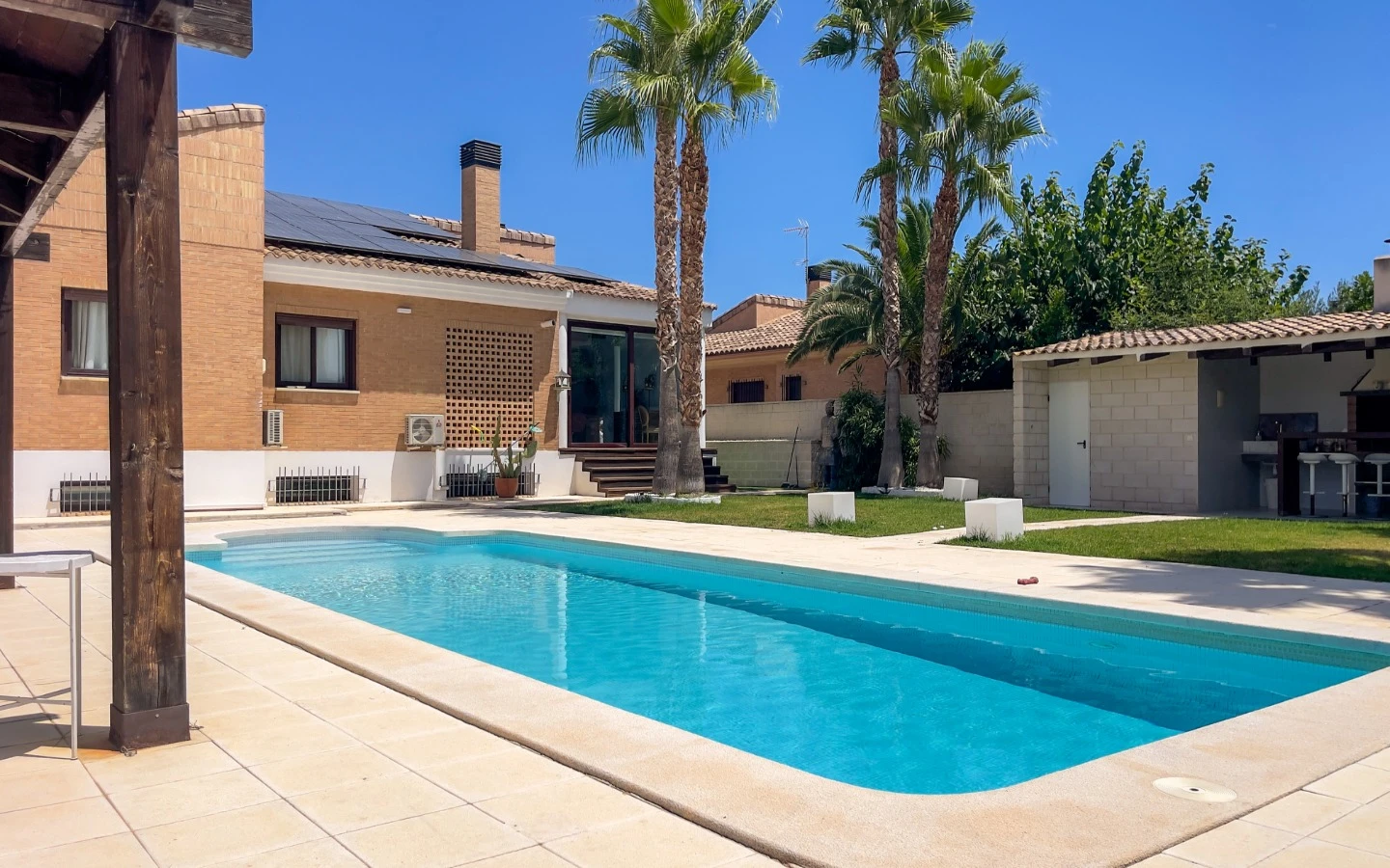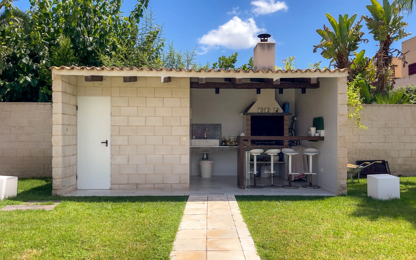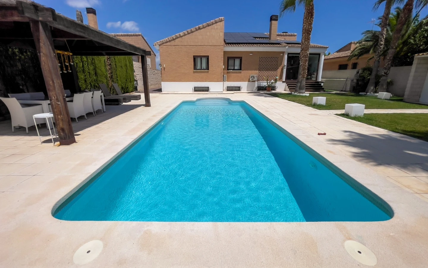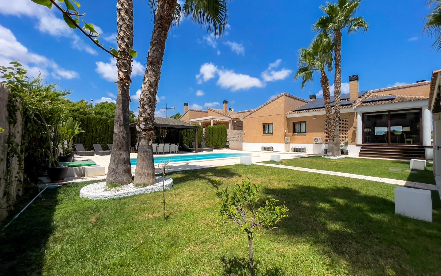 El jardín refleja el mismo cuidado que los interiores: palmeras maduras, senderos escultóricos, iluminación ambiental y vegetación cuidadosamente seleccionada enmarcan una piscina de agua salada, más suave y de bajo mantenimiento que el cloro. Una terraza cubierta, zona de comedor, barbacoa y salón al aire libre ofrecen rincones para disfrutar en cualquier momento del día. Las placas solares, instaladas en 2025, garantizan un uso energético eficiente y sostenible, sin comprometer la estética. La entrada privada y cerrada conduce a un aparcamiento dentro de la parcela, discretamente ubicado para mayor comodidad.