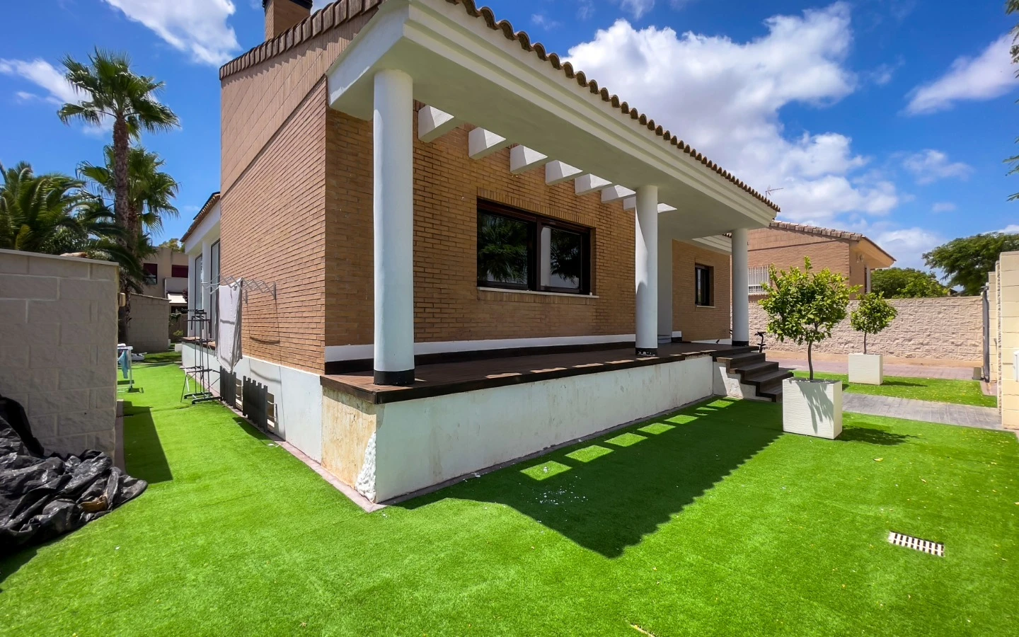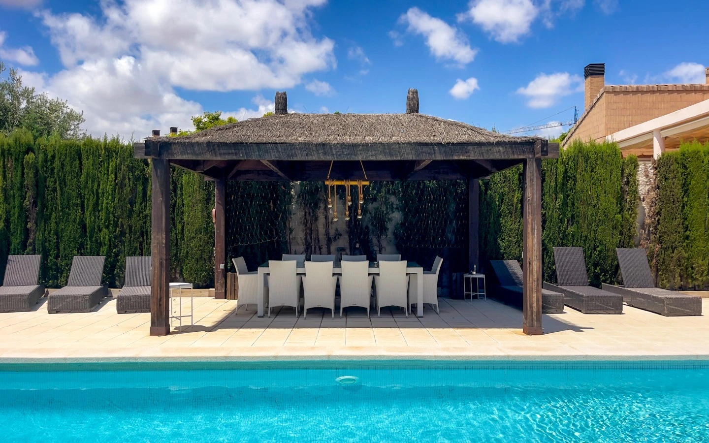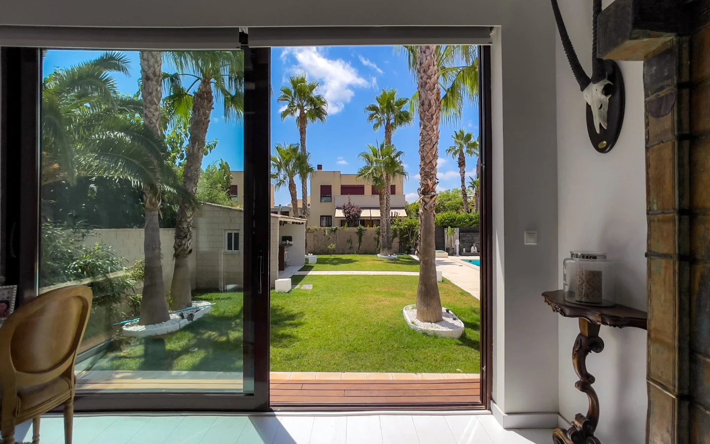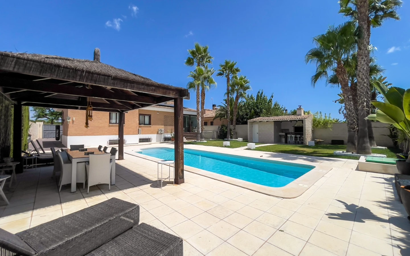 El jardín refleja el mismo cuidado que los interiores: palmeras maduras, senderos escultóricos, iluminación ambiental y vegetación cuidadosamente seleccionada enmarcan una piscina de agua salada, más suave y de bajo mantenimiento que el cloro. Una terraza cubierta, zona de comedor, barbacoa y salón al aire libre ofrecen rincones para disfrutar en cualquier momento del día. Las placas solares, instaladas en 2025, garantizan un uso energético eficiente y sostenible, sin comprometer la estética. La entrada privada y cerrada conduce a un aparcamiento dentro de la parcela, discretamente ubicado para mayor comodidad.