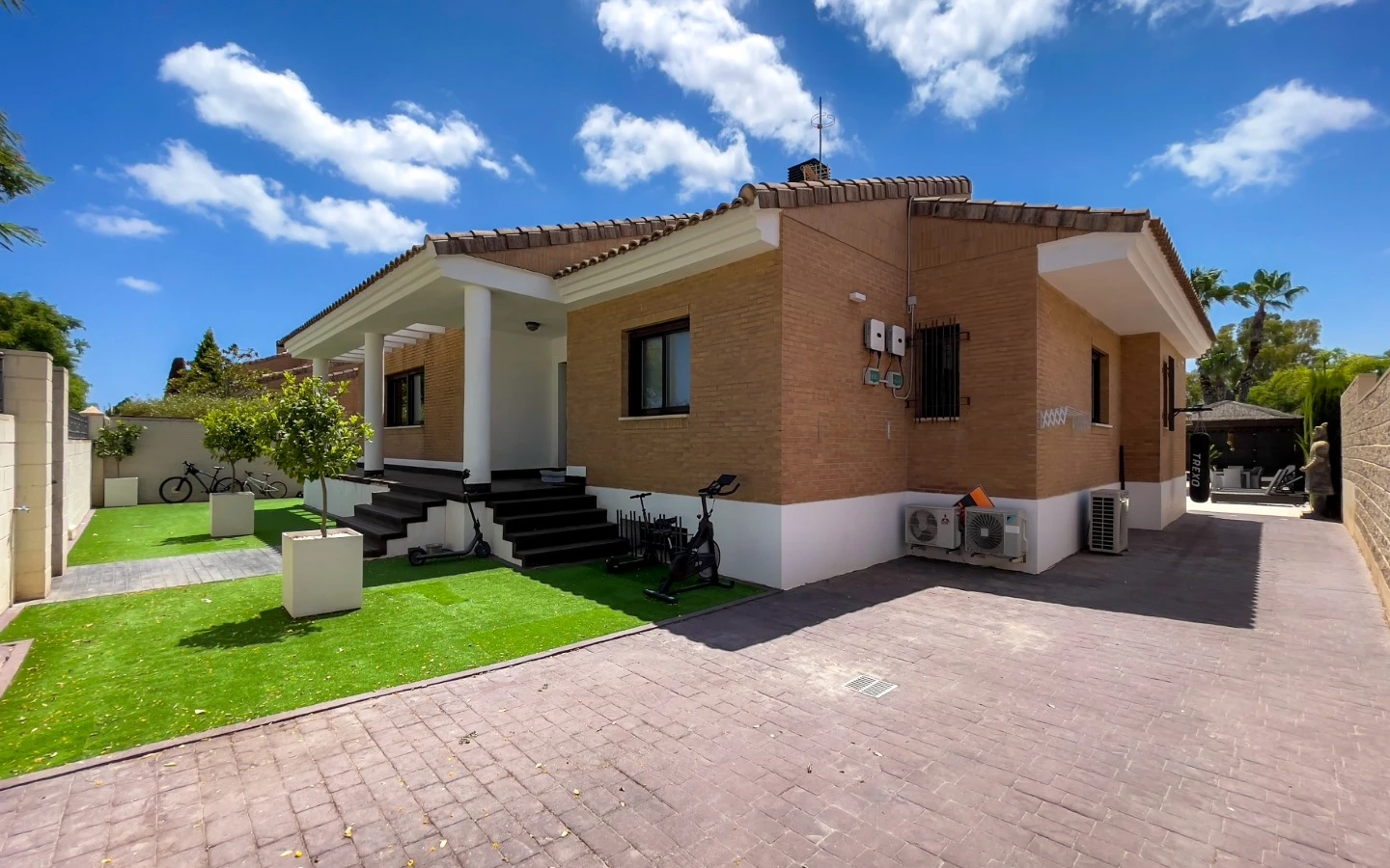 Entre las características adicionales destacan el sistema de climatización Airzone en la planta principal, aire acondicionado convencional en la planta inferior, lavandería independiente, zonas de almacenamiento, vestidores, y un jardín exquisitamente diseñado con iluminación arquitectónica y detalles escultóricos.
