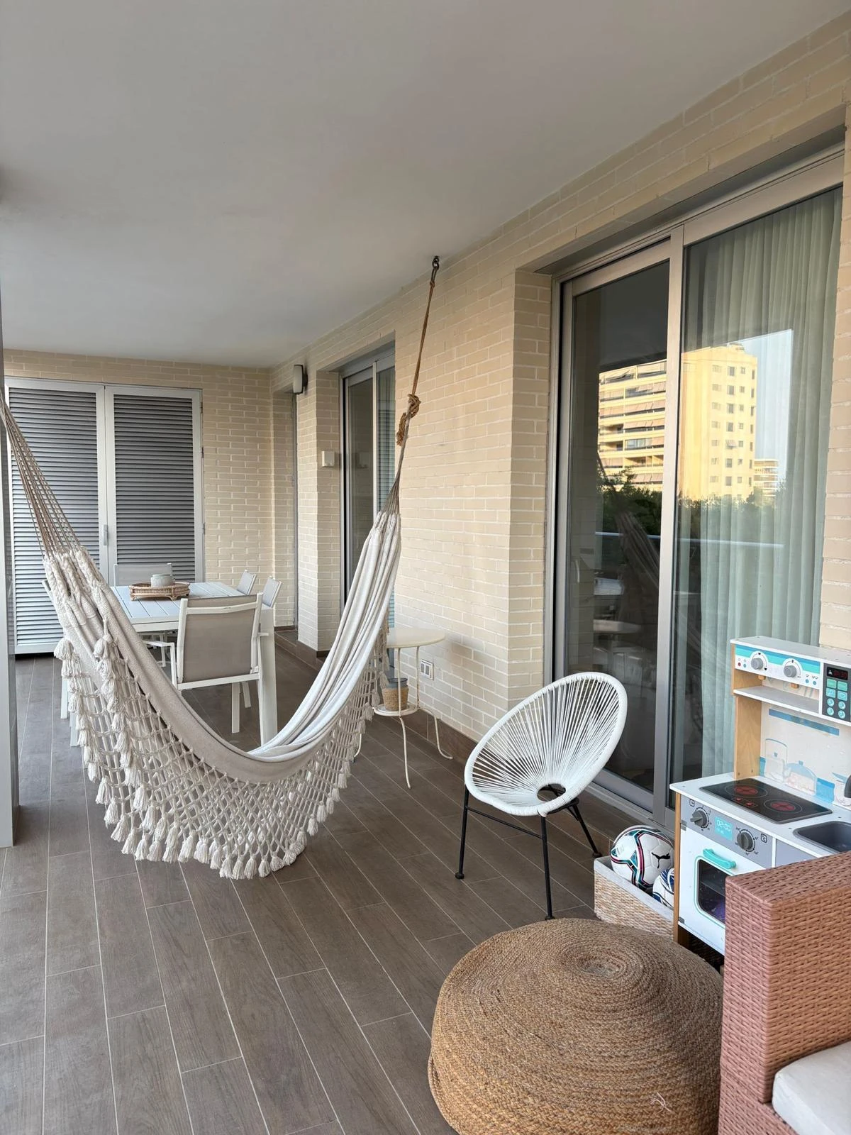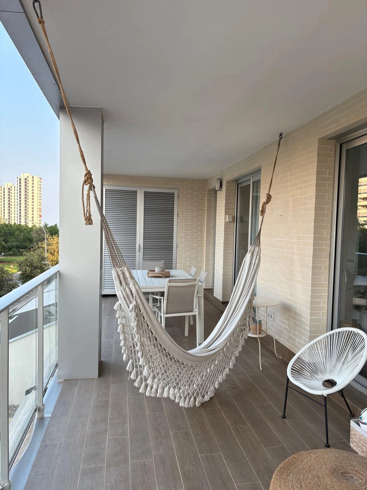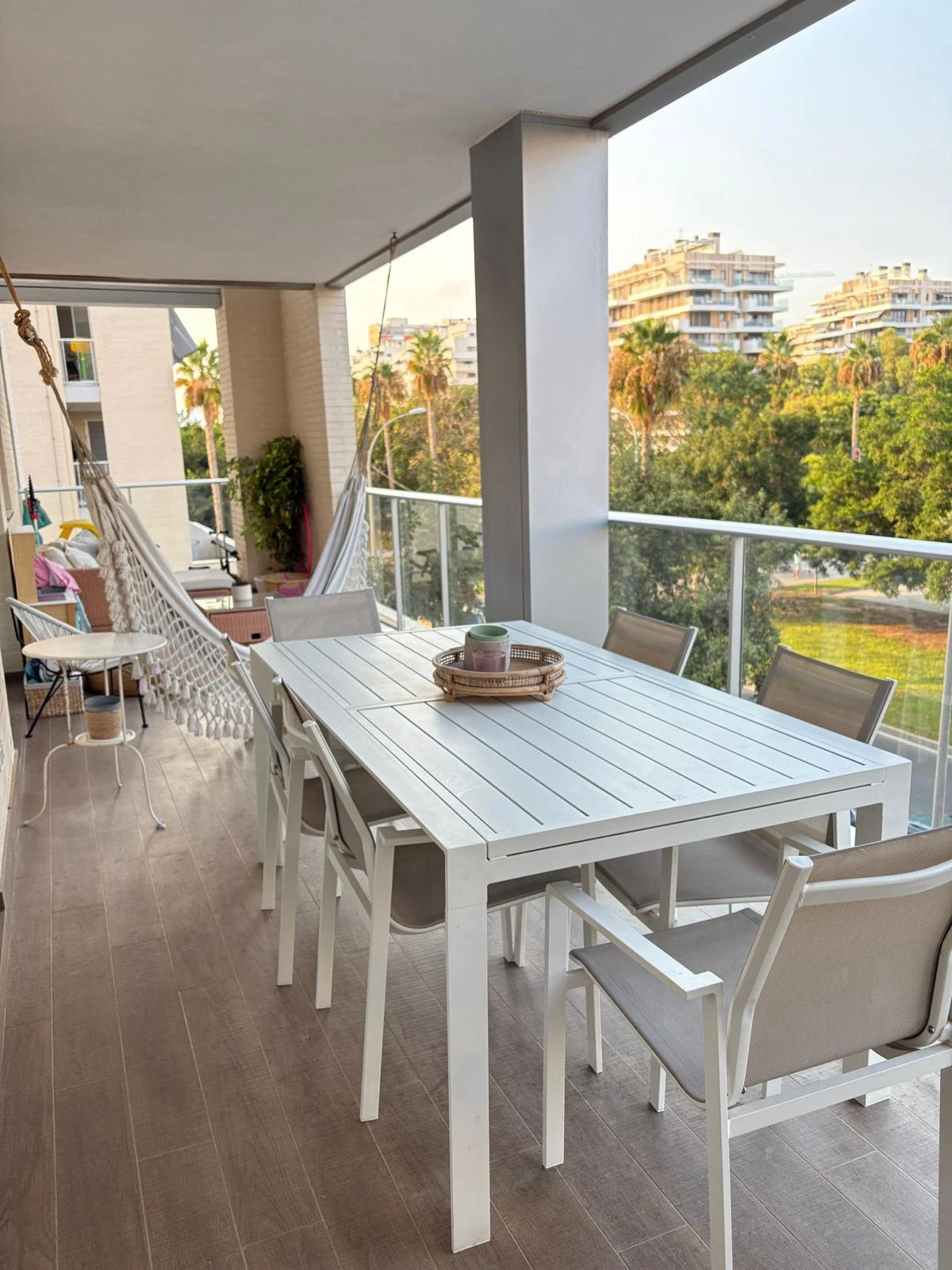 La terraza cubierta aporta un gran atractivo al apartamento. Funciona como una extensión natural del interior y ofrece un espacio adicional para desayunar, trabajar con el portátil, relajarse en silencio o recibir invitados. Gracias a su diseño es cómoda y práctica durante todo el año.