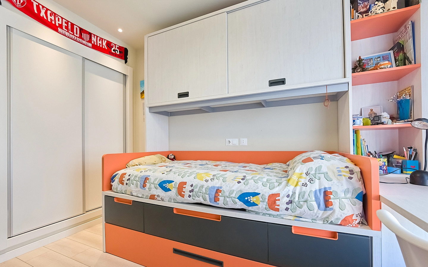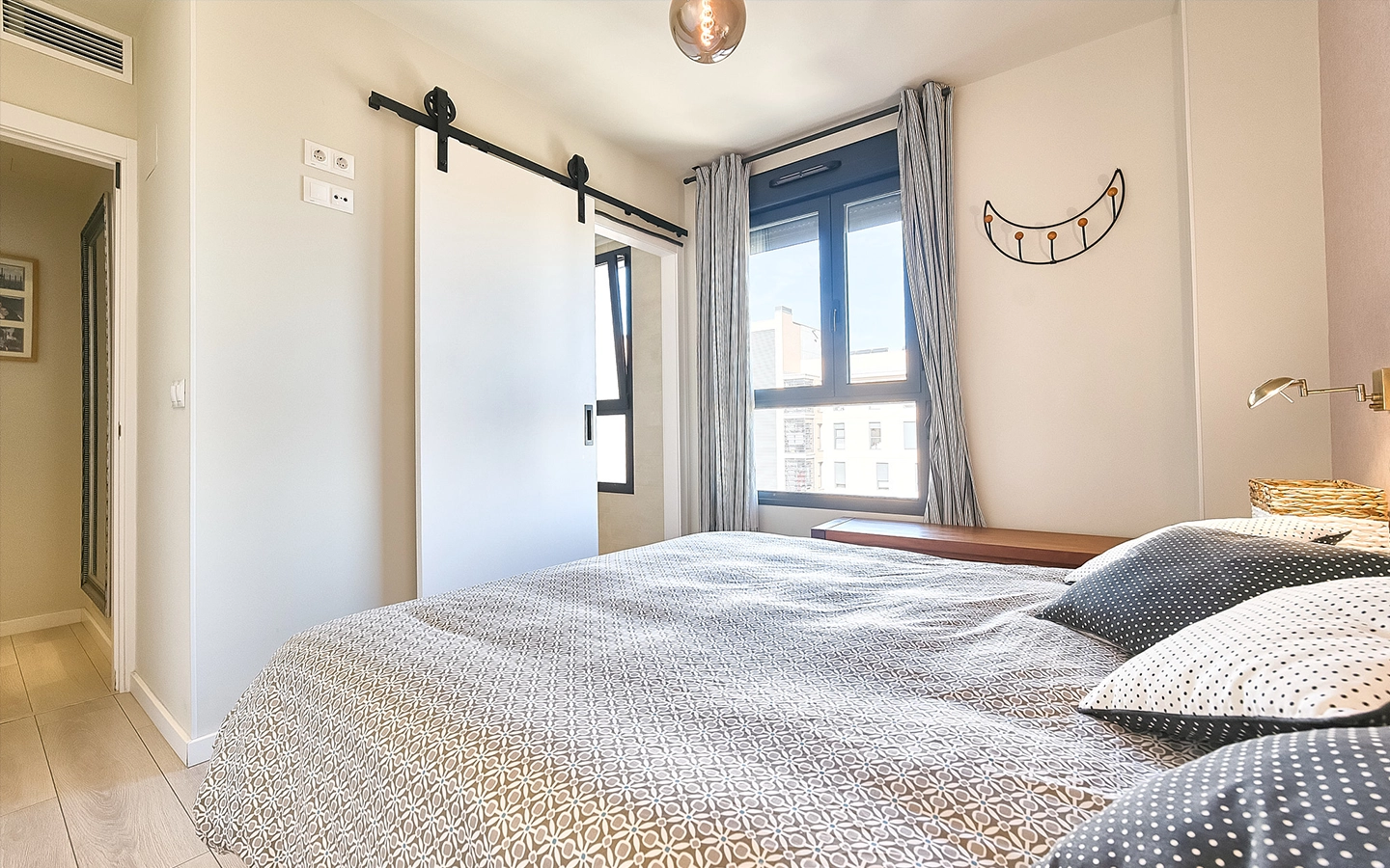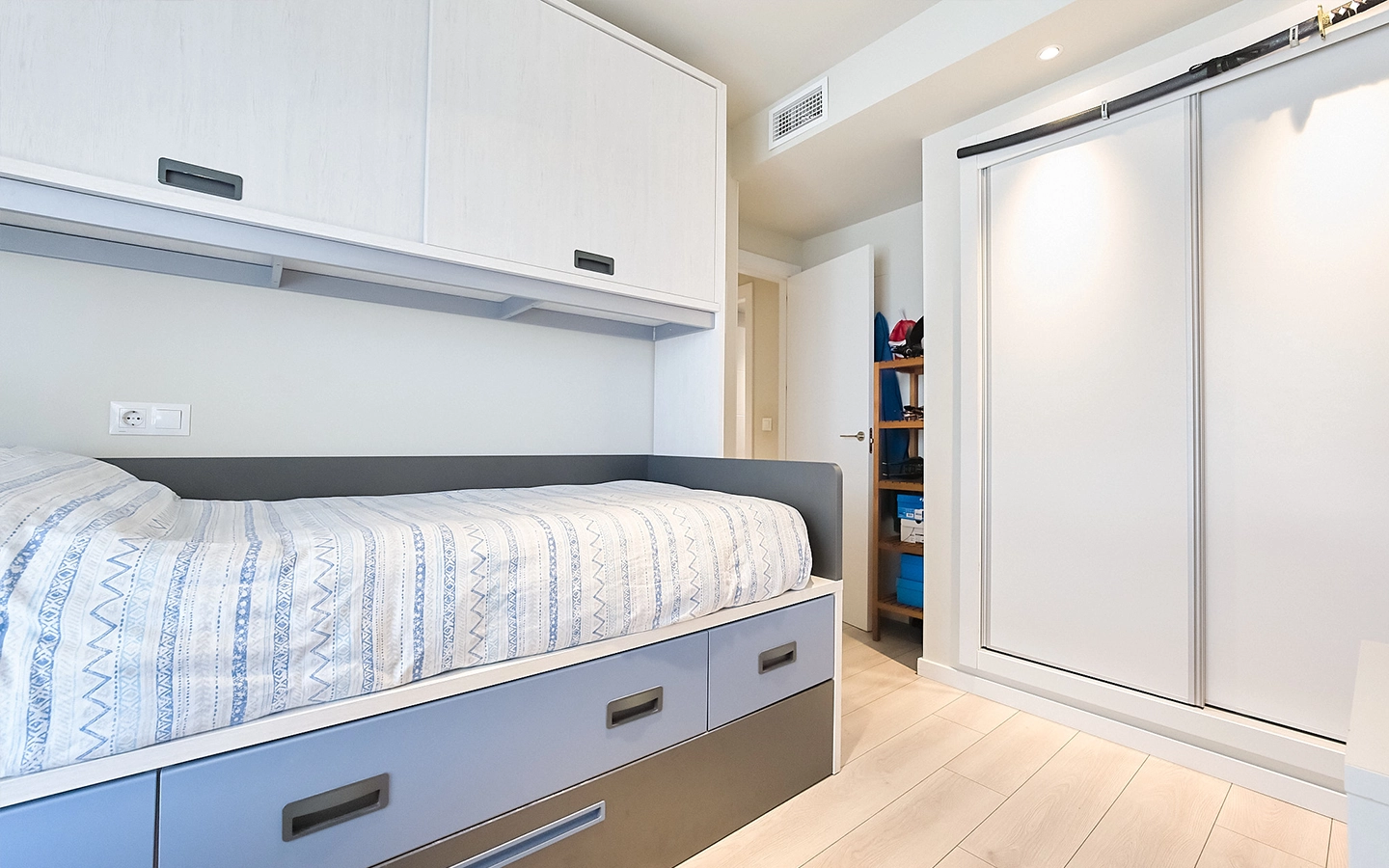 Спальные комнаты оформлены в нейтральной цветовой гамме, способствующей расслаблению и комфорту. Большие окна наполняют комнаты естественным светом и открывают виды на городской пейзаж. Встроенные шкафы обеспечивают достаточно места для хранения.