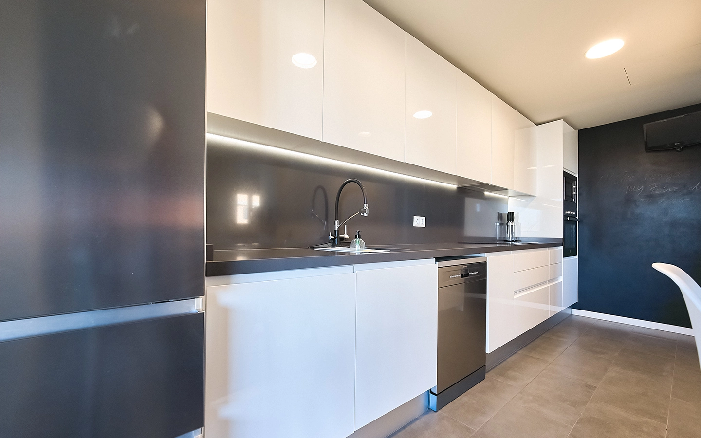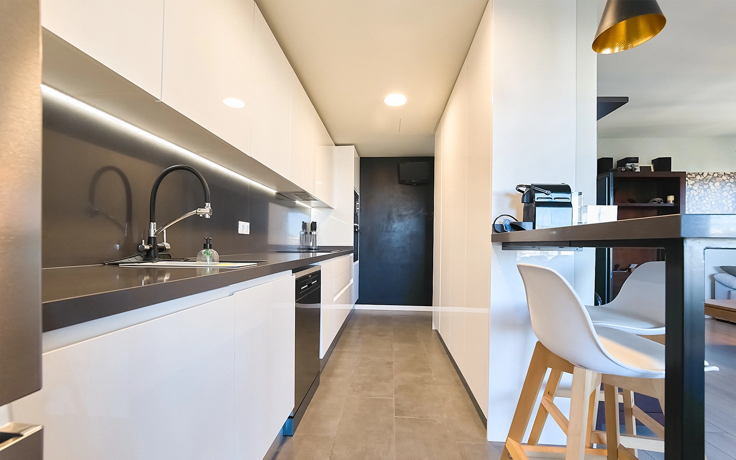 Кухня, современная и функциональная, оборудована встроенной техникой и просторными системами хранения. Эргономичное расположение элементов делает эту зону идеальной для приготовления пищи и семейных ужинов.