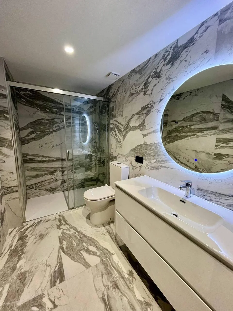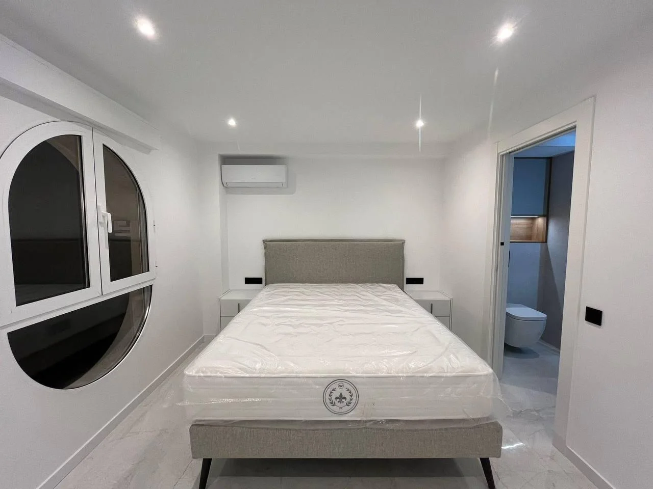 В квартире два комфортабельных спальни с встроенными шкафами, одна из которых выделяется большими панорамными окнами закруглённой формы. Два санузла выполнены в современном стиле, оборудованы душевыми кабинами с прозрачным стеклом, подвесной сантехникой и отделкой крупноформатной плиткой, что придаёт пространству ощущение простора и элегантности.