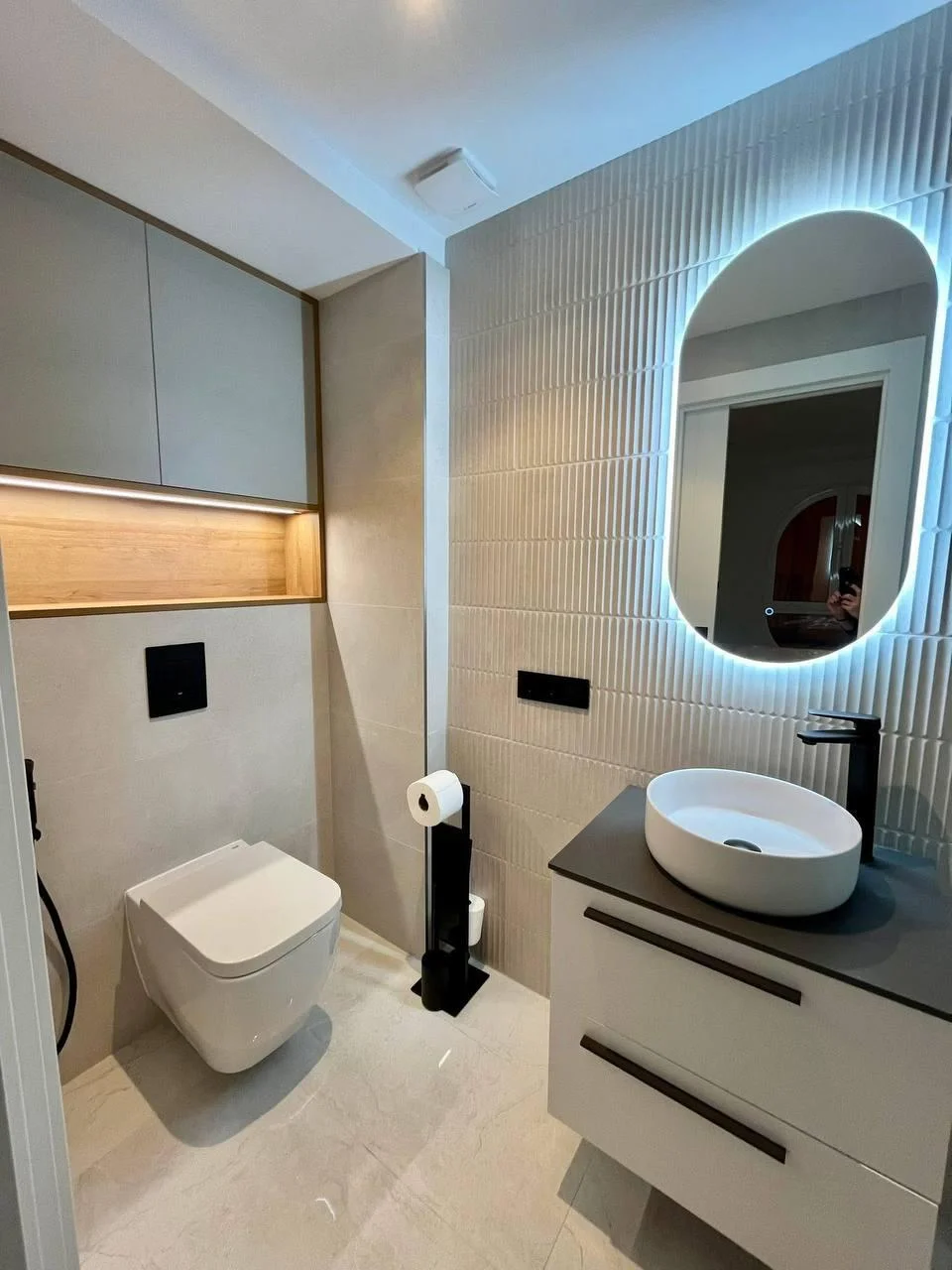 Внутреннее пространство сочетает современные линии с характерными акцентами. Просторная и светлая гостиная-столовая с декоративной стеной из натурального камня и продуманной подсветкой создаёт тёплую и уютную атмосферу. Кухня открытая, но визуально отделена, оснащена мебелью на заказ в отделке под дерево и белым глянцем, рабочей поверхностью из качественного искусственного камня и встроенной бытовой техникой.