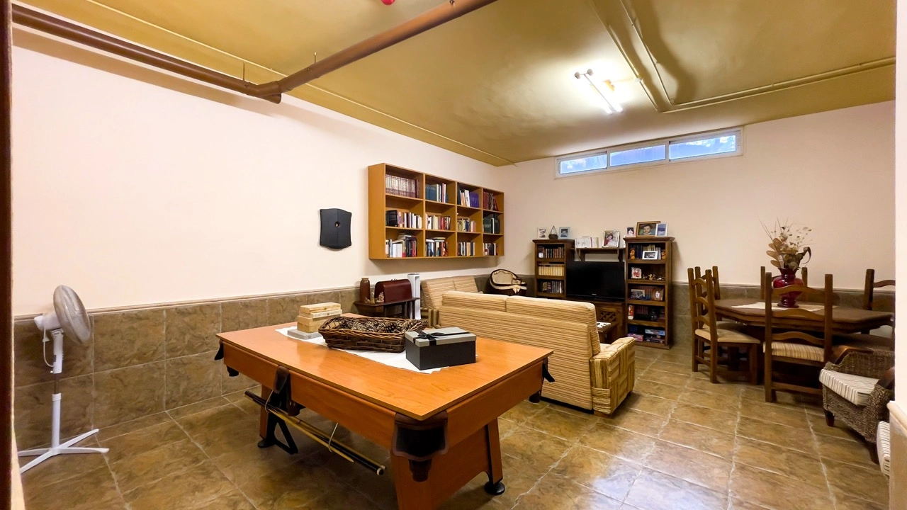 На нижнем уровне расположена большая социальная и развлекательная зона, служащая вторым местом для встреч внутри дома. Здесь находится собственная кухня и зона отдыха, оборудованная бильярдным столом, игровым столом, консолями, дартсом и лаунж-зоной, идеальное пространство для неформальных встреч и досуга. Прямой доступ к подземному паркингу добавляет функциональности, а террасы и внешние пространства завершают образ большой, ухоженной недвижимости, созданной для комфортной жизни и наслаждения временем дома.