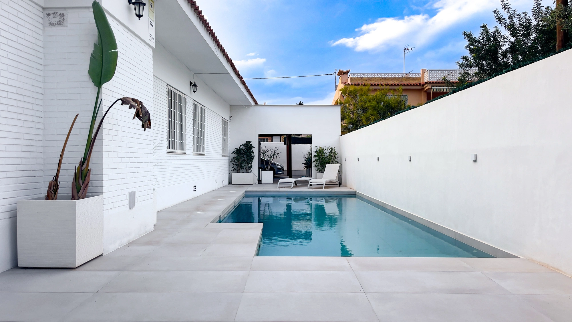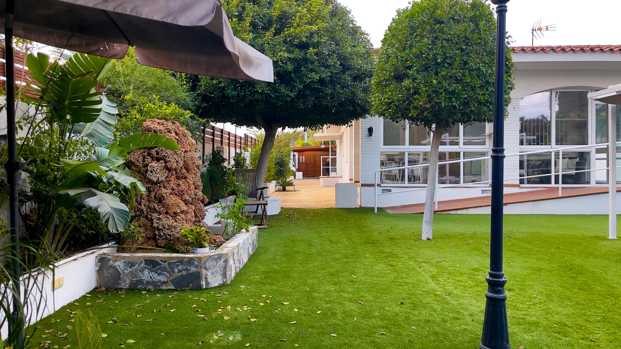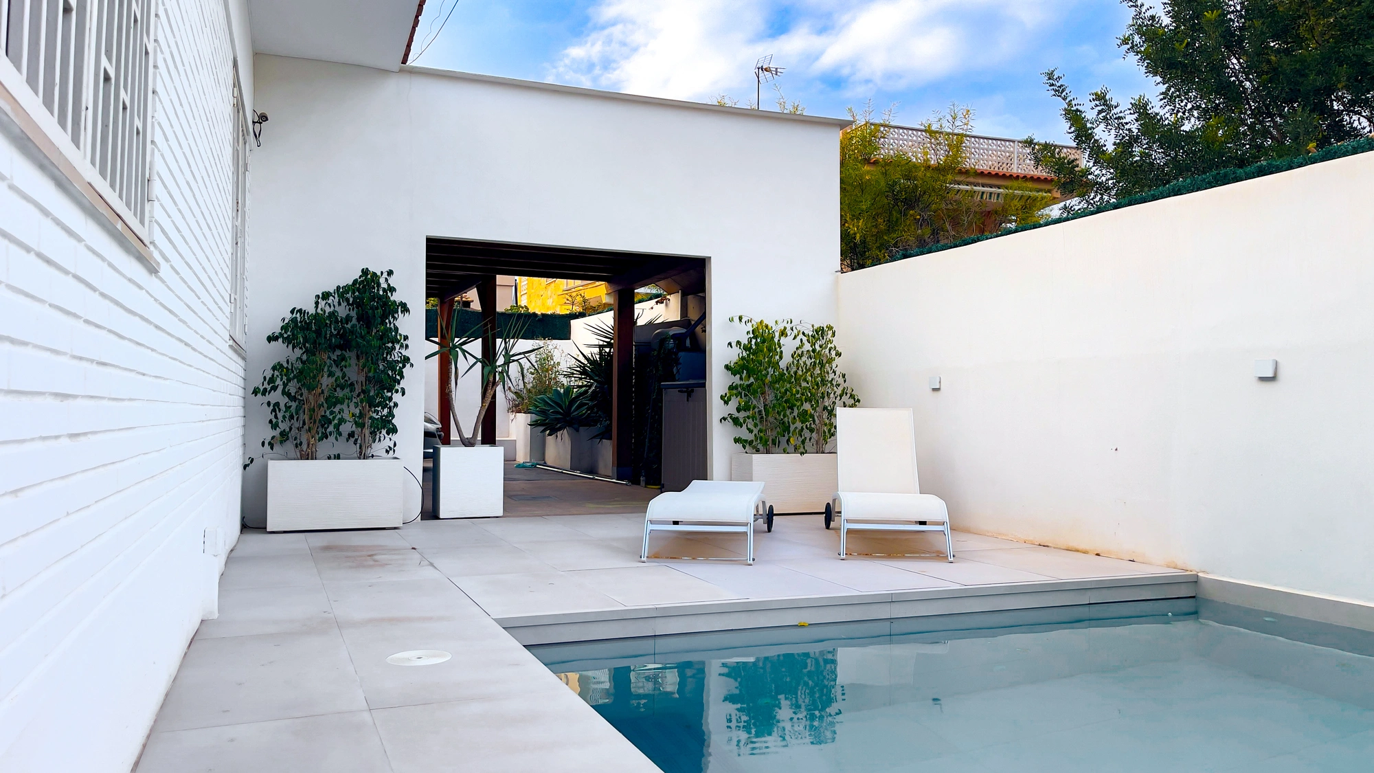 Одним из главных преимуществ дома является частный участок с просторными внешними зонами для отдыха. Ухоженный сад формирует несколько уютных пространств для отдыха на свежем воздухе, среди которых выделяется зона бассейна. Бассейн оснащён системой климат-контроля и раздвижной крышей, которая позволяет закрывать его, когда он не используется, и продлевает сезон купания.