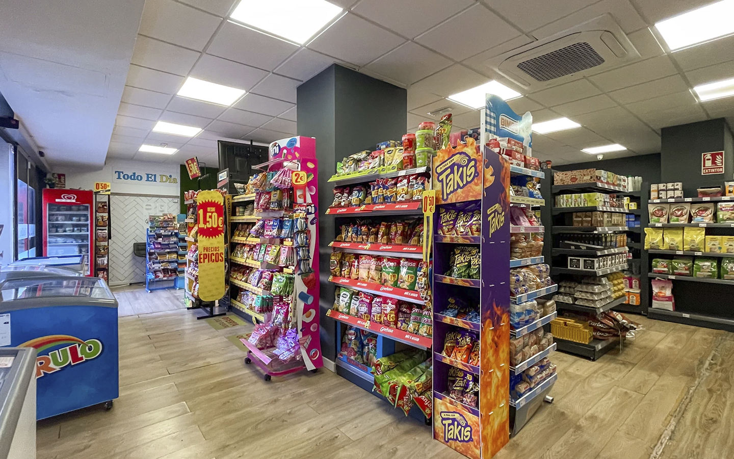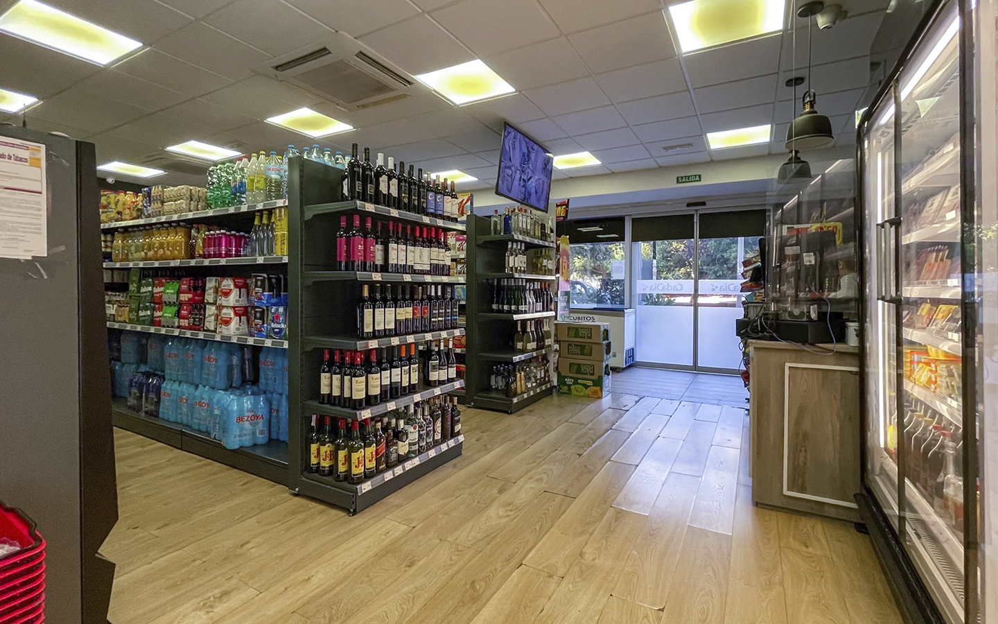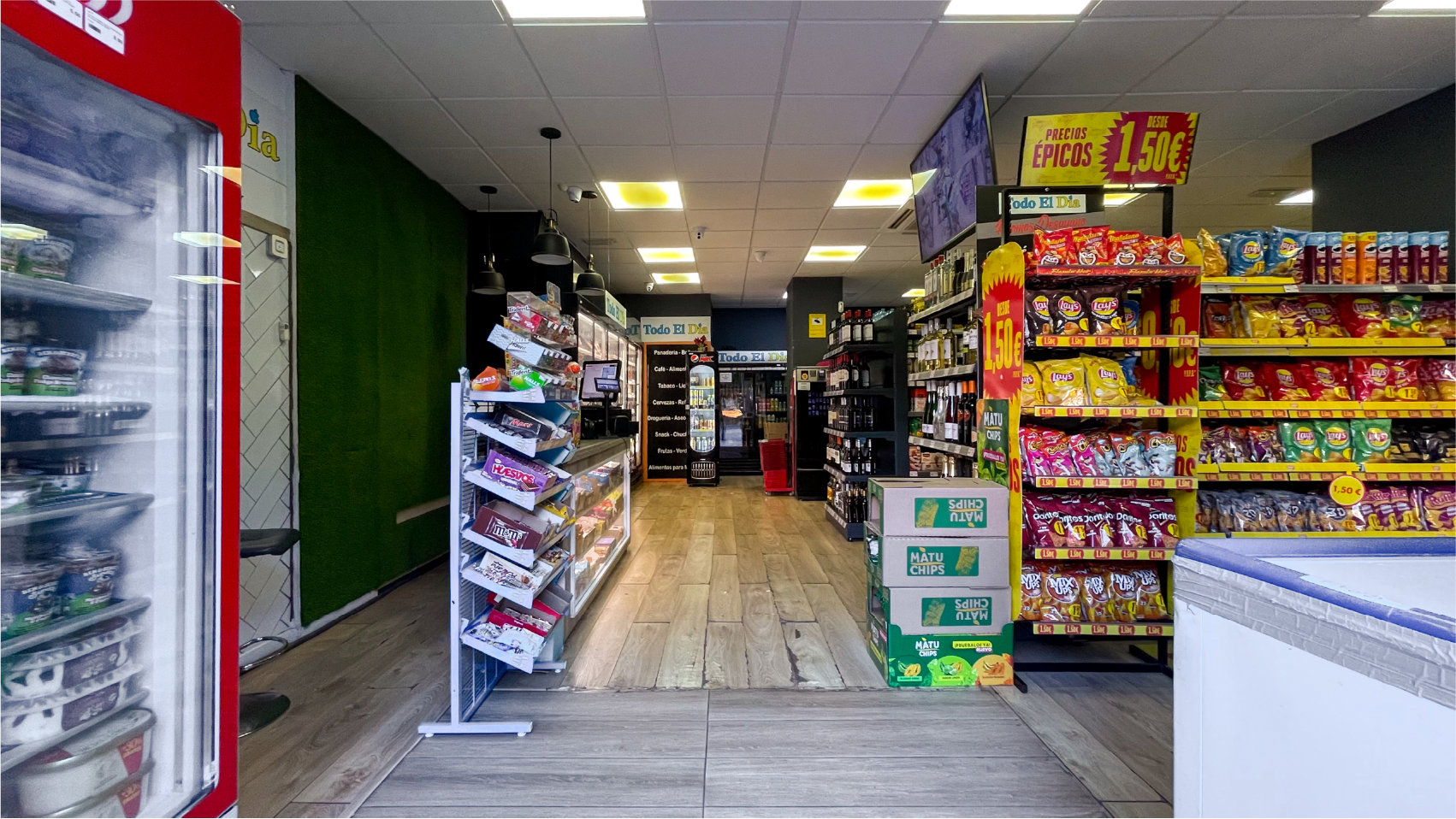 Интерьер оформлен в современном стиле: тёплое освещение, деревянные полы, аккуратно организированные стеллажи. В помещении установлены холодильные витрины, профессиональная кофемашина, витрина с выпечкой, кассовая зона, система кондиционирования и отдельное помещение под склад. Каждая деталь продумана для удобства персонала и комфортной атмосферы для клиентов.